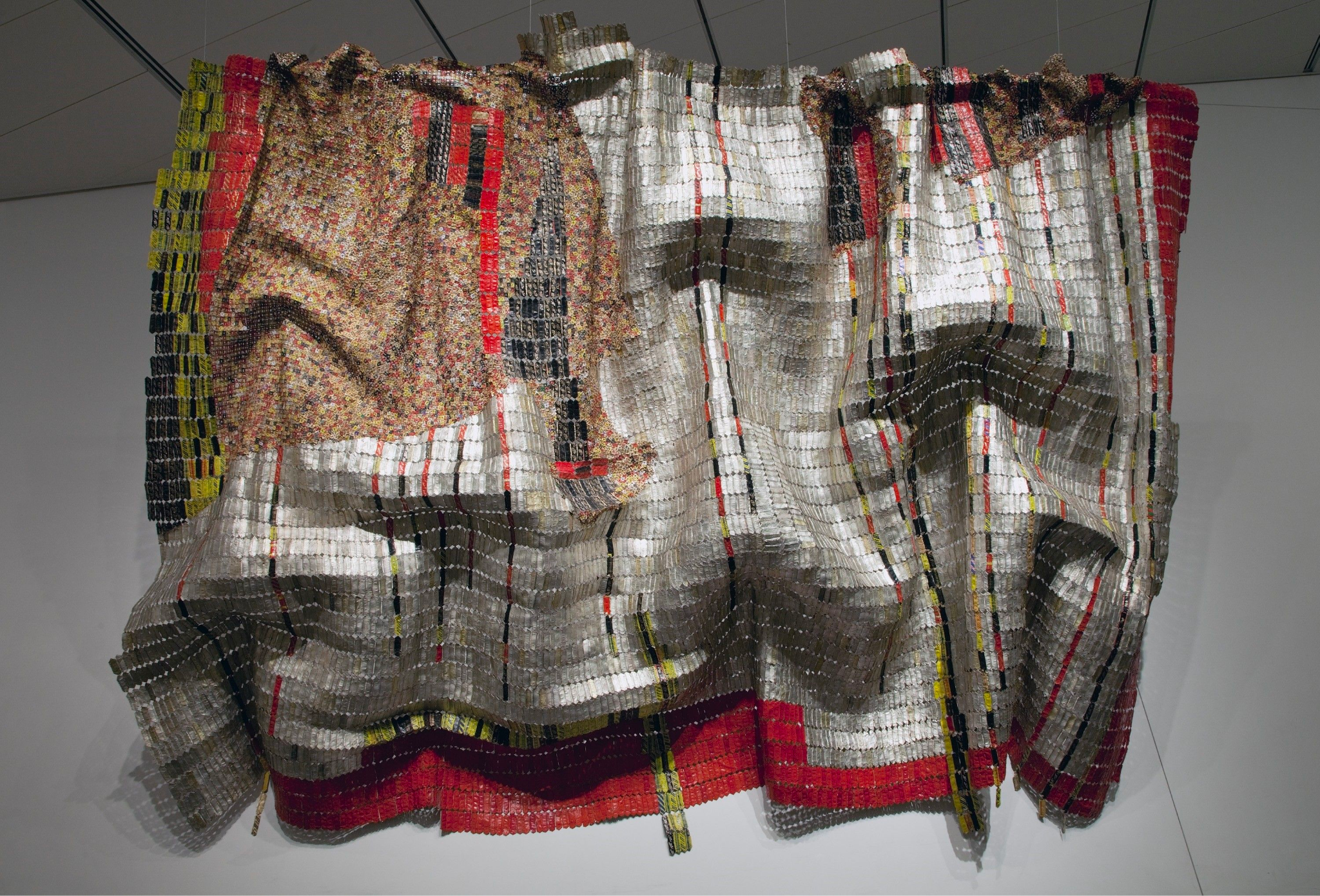 Another contemporary work, the artist El Anatsuil uses copper wire and found bottle caps to reimagine traditional weaving styles and color palettes. The massive piece hangs above the show, leading viewers to notice its references and connections to other traditional works around it.
