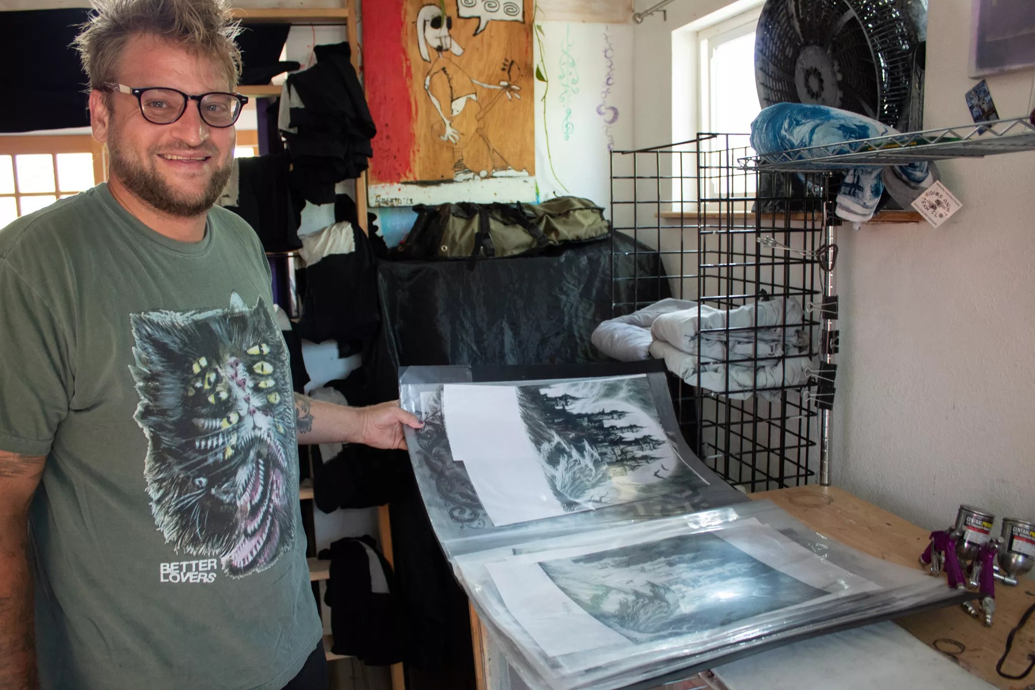 Other ambitions include teaching courses about the unique printing style – something he’s regularly approached about at art shows – though without a washing machine present, the process can’t be taught in full. Usrey’s inventory in his home studio, prepped to be sold at street fairs and local markets. Nate Day