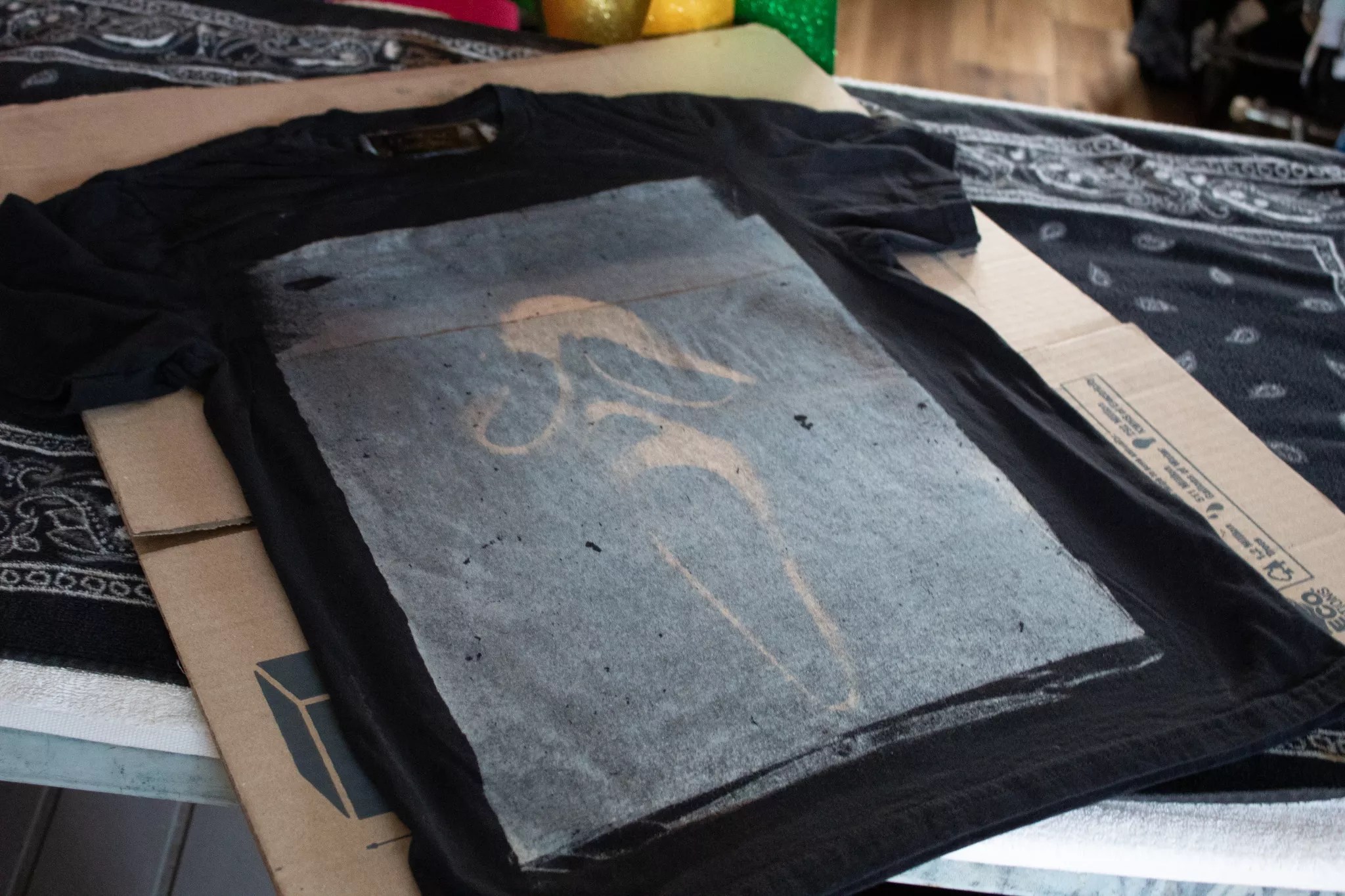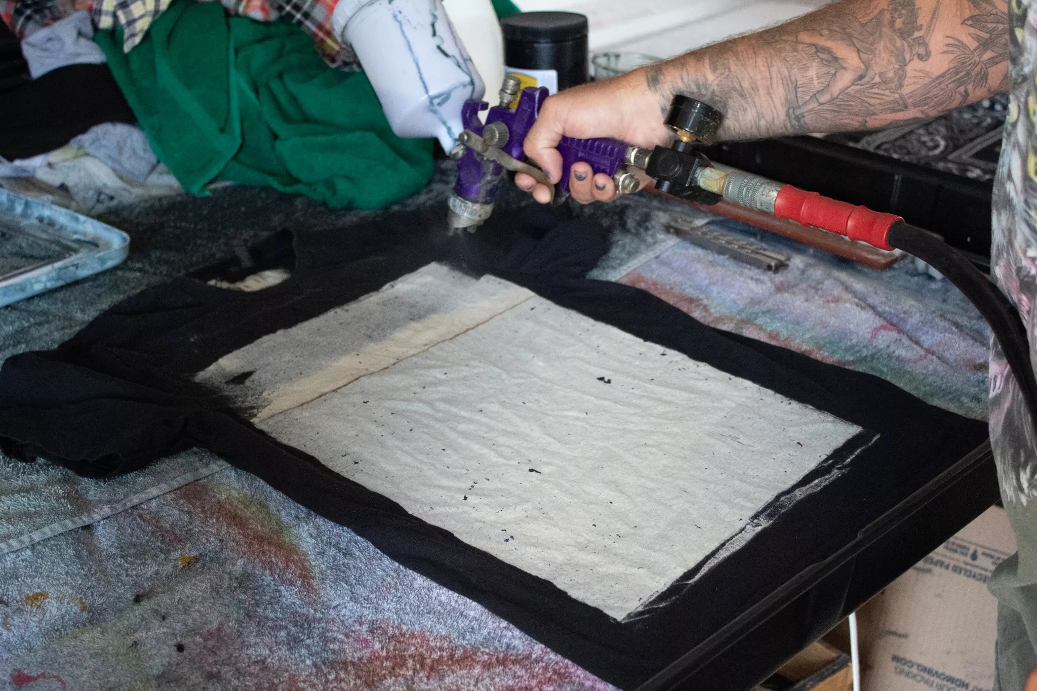Step one is bleaching a shirt, usually a plain black T-shirt or an upcycled flannel, with a specialized chemical that requires heat from a 400-degree press to activate, allowing the colors to develop richly in the sun. “If you’ve ever tried to bleach black, it comes out orange or peach,” Usrey explains. “It’s hard to get a direct white with it. But it smells horrible, I’m warning you.”