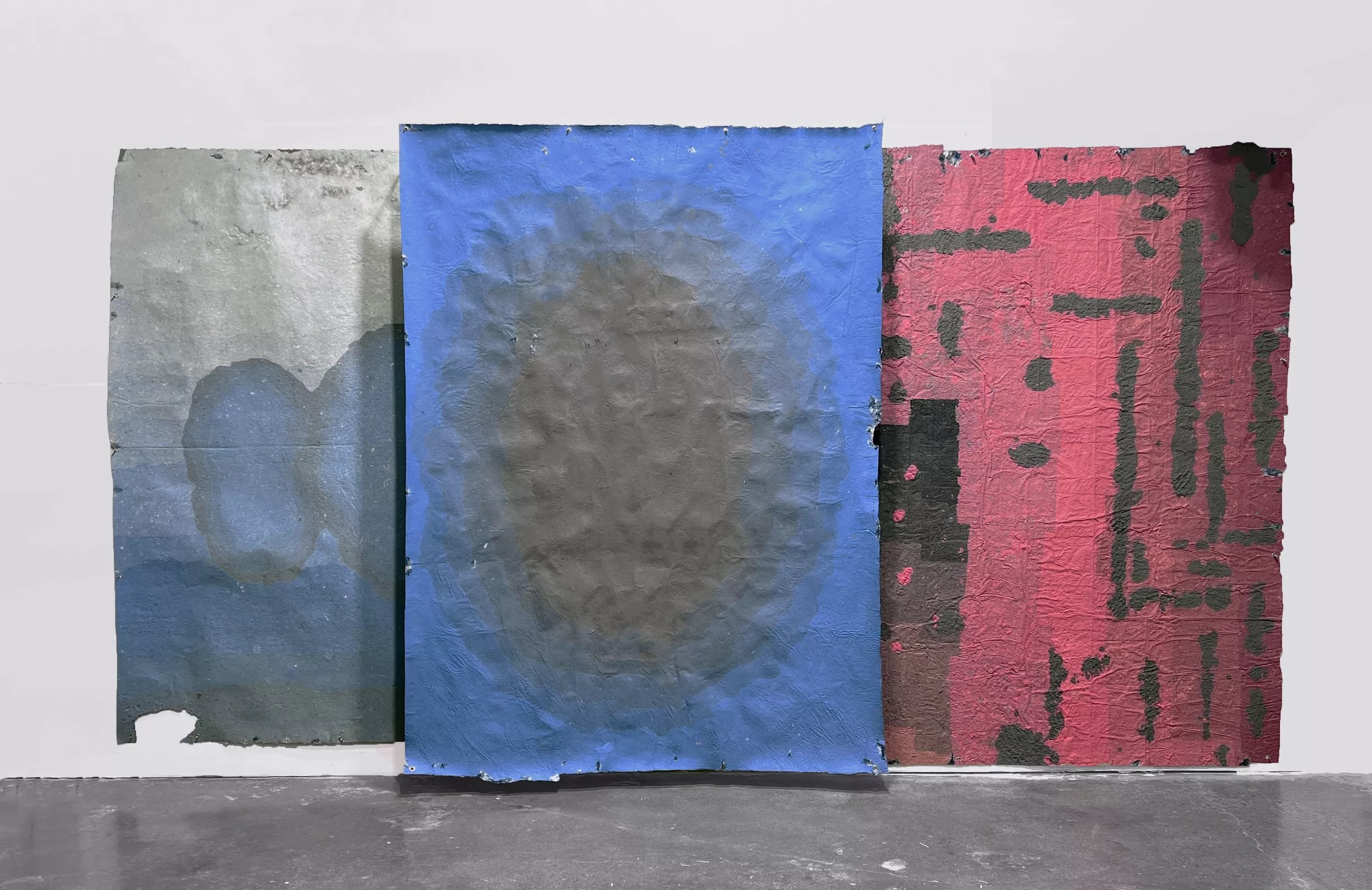 Hong Hong, born in Hefei, China, and now working in Massachusetts, makes large-scale paper works in a reverent spiritual practice tied to the land. More than site-specific, the paper that forms her work actually melds with the earth: Hong travels from place to place to pour the pulp directly on the ground in layers to dry in the sun, leaving behind rough textures and torn edges. These earthen leaves of paper inspire her to collect writings personal or borrowed, which in turn form titles.