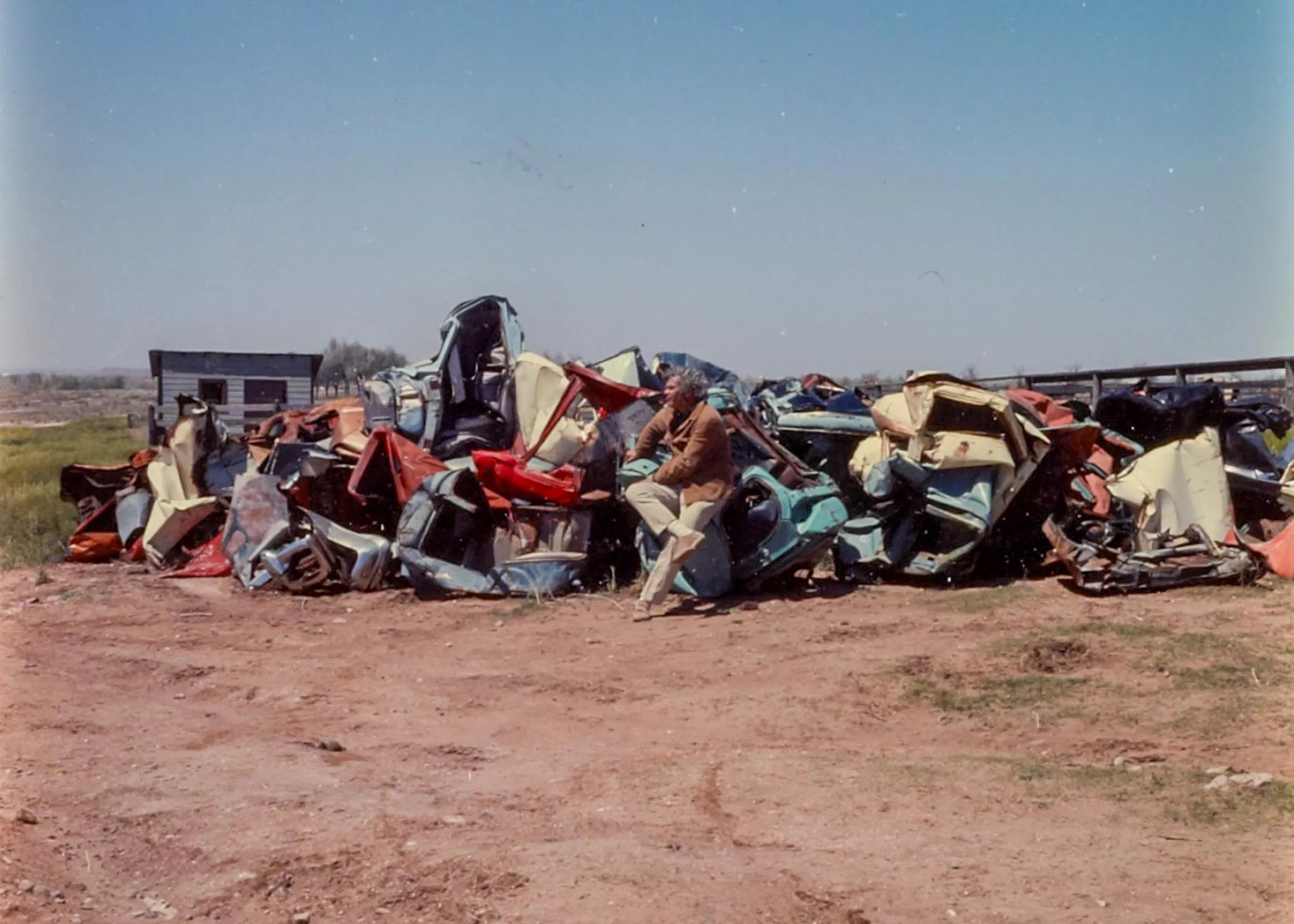 John Chamberlain among his raw materials at Stanley Marsh 3’s ranch, Toad Hall, Amarillo, Texas, 1972.