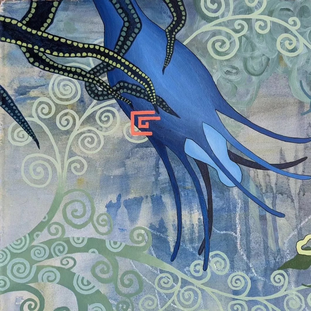 Gail Wagner, “Undaria†(detail), 2023, acrylic, wax resist, paint marker on Arches paper.