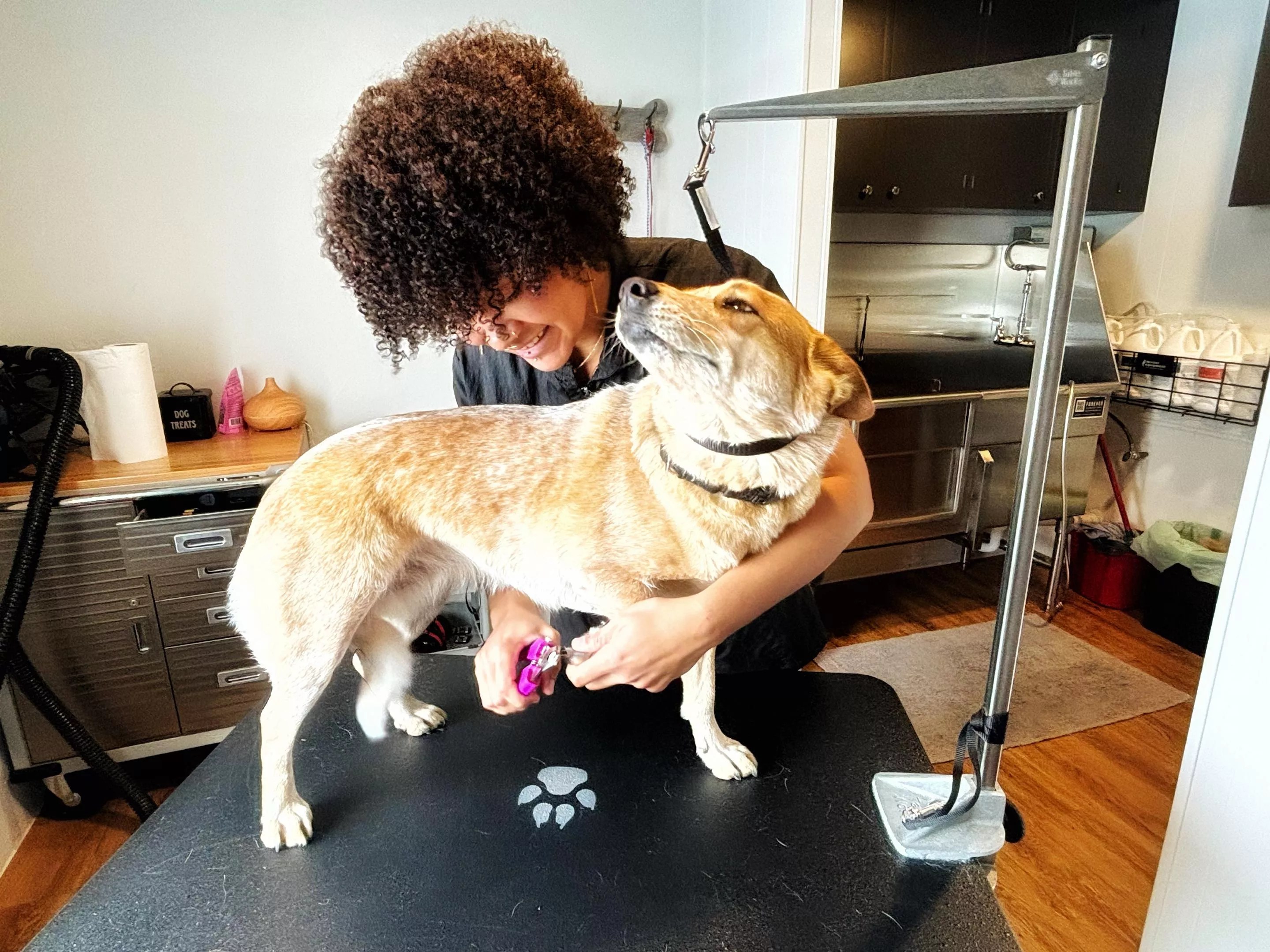 Kēnya Stoute gives her dog, Taxi, a nail trimming in the grooming room at Permatierra.