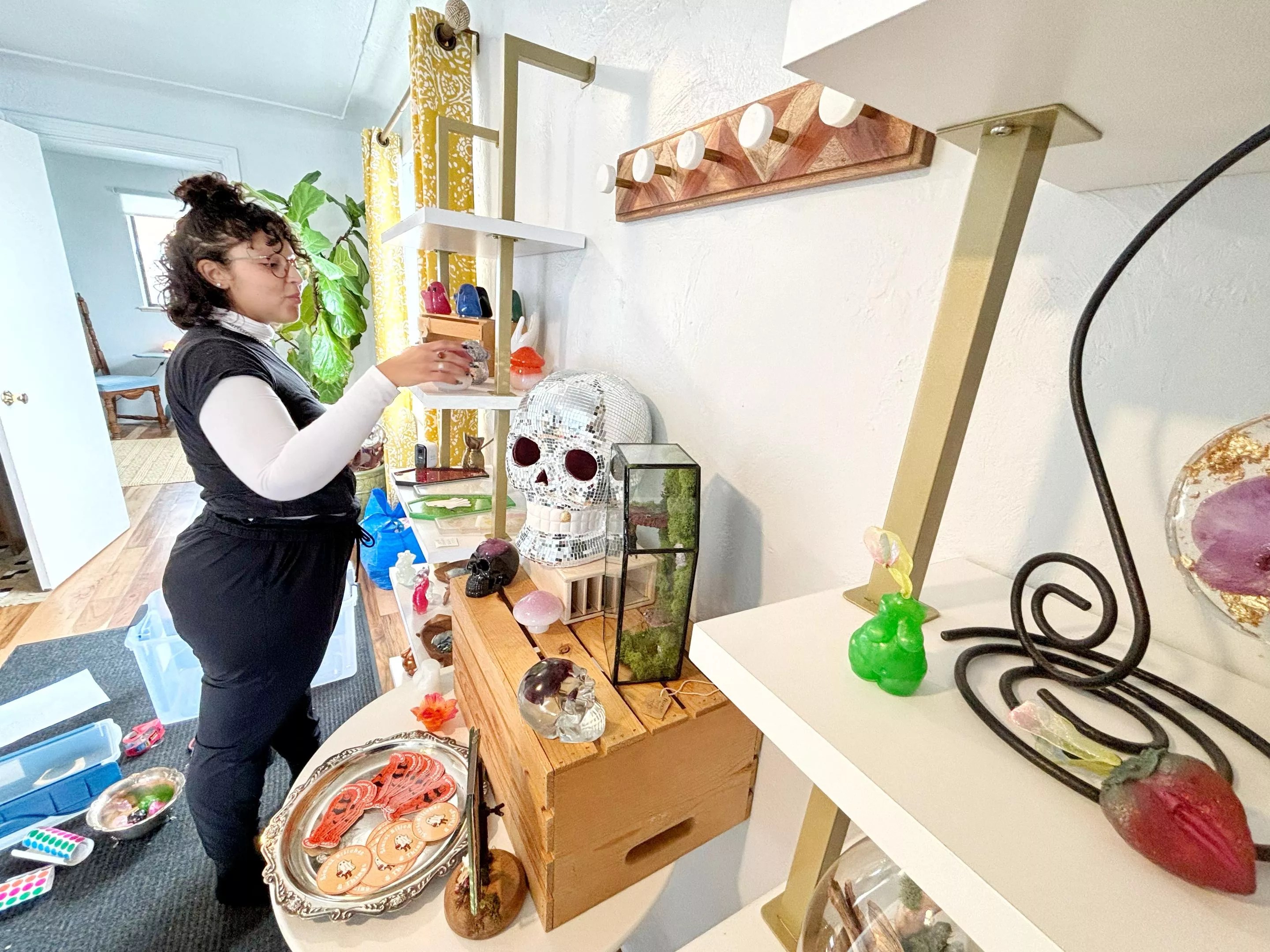 Local artist Nastassia Costache merchandising the retail space with her products.