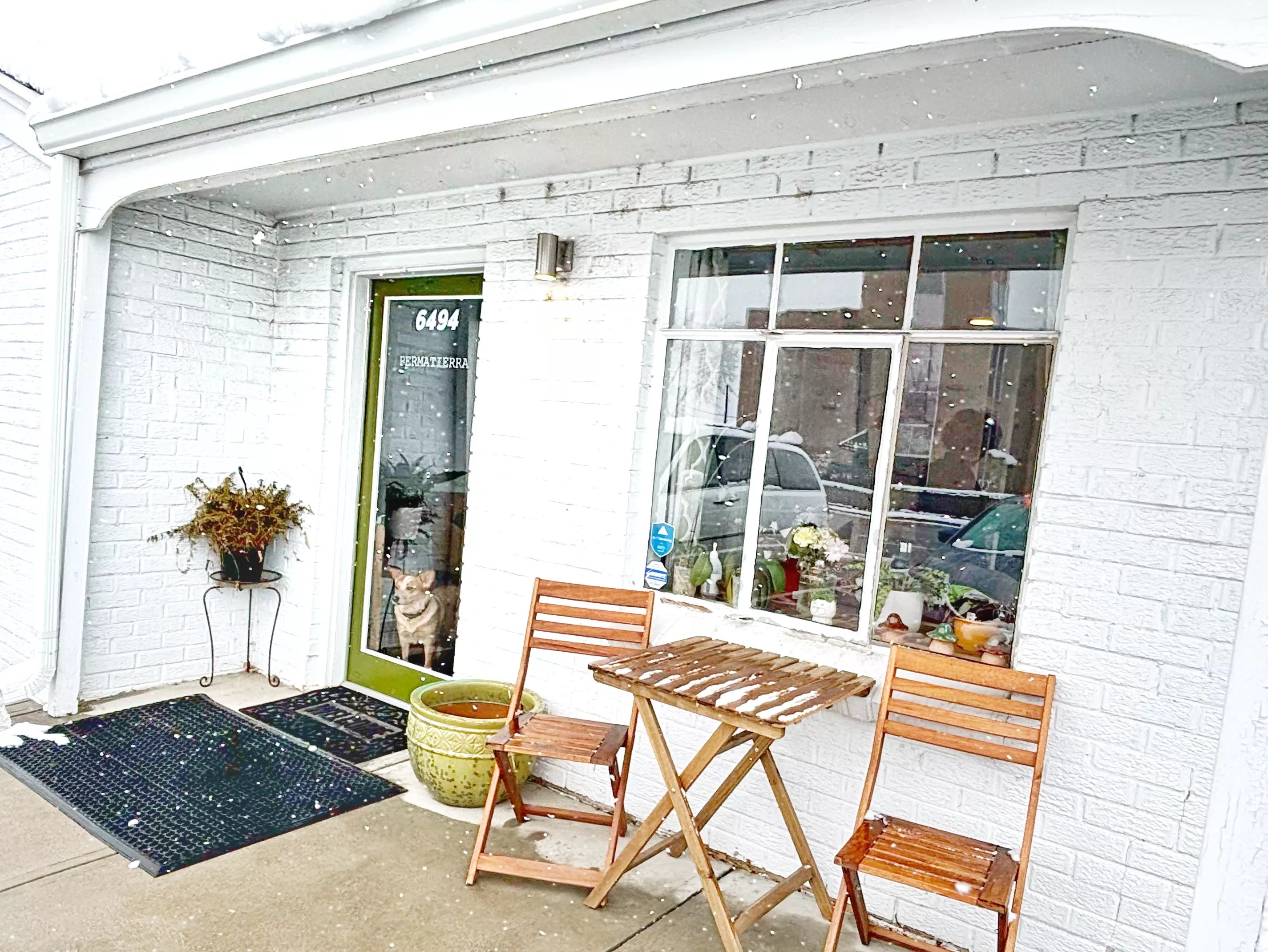 The entrance to Permatierra, with shop dog Taxi looking out the window at the snow.