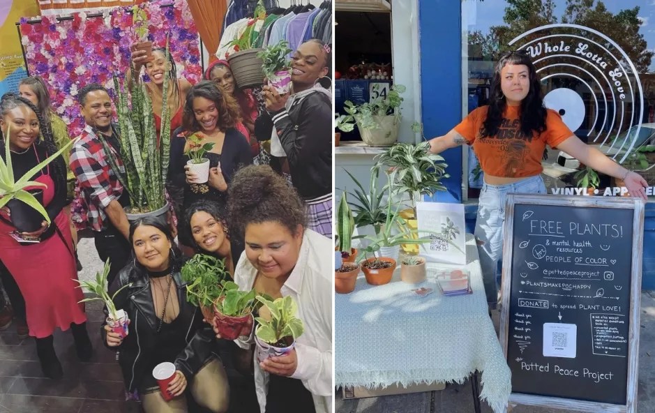 Potted Peace Project co-founder Sarah Gilstrap and happy community members with their new plants.