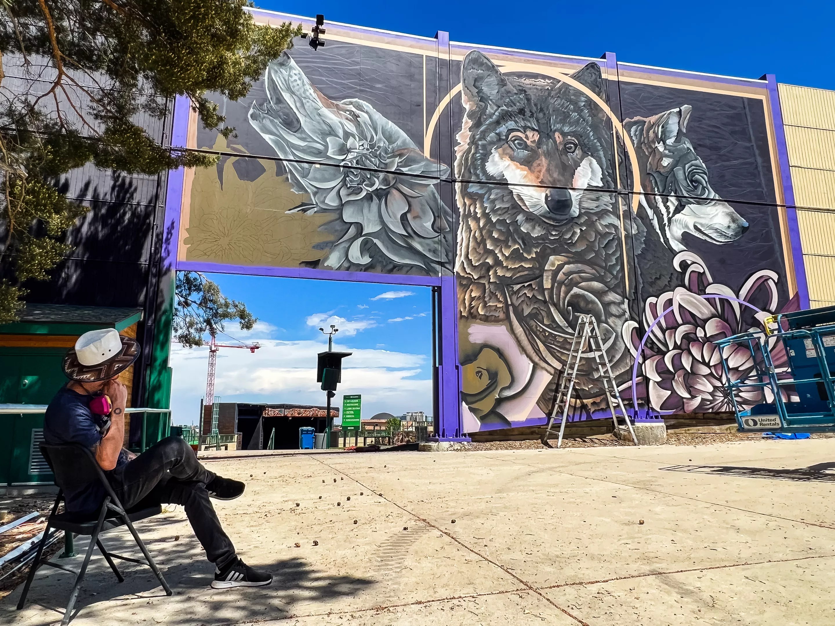 Adden J contemplates his wolf mural at Fiddler’s Green Amphitheatre.