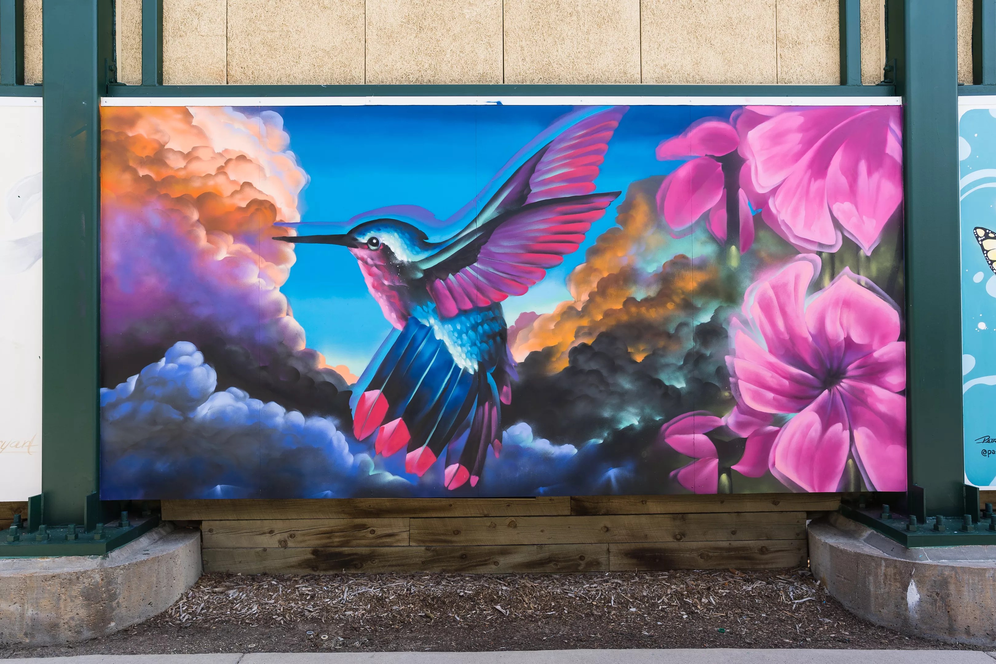 Another Denver art-scene veteran, Chad Bolsinger, took a vibrant approach for his colorful hummingbird, which hovers over a backdrop of complementary colors and fuchsia flowers.