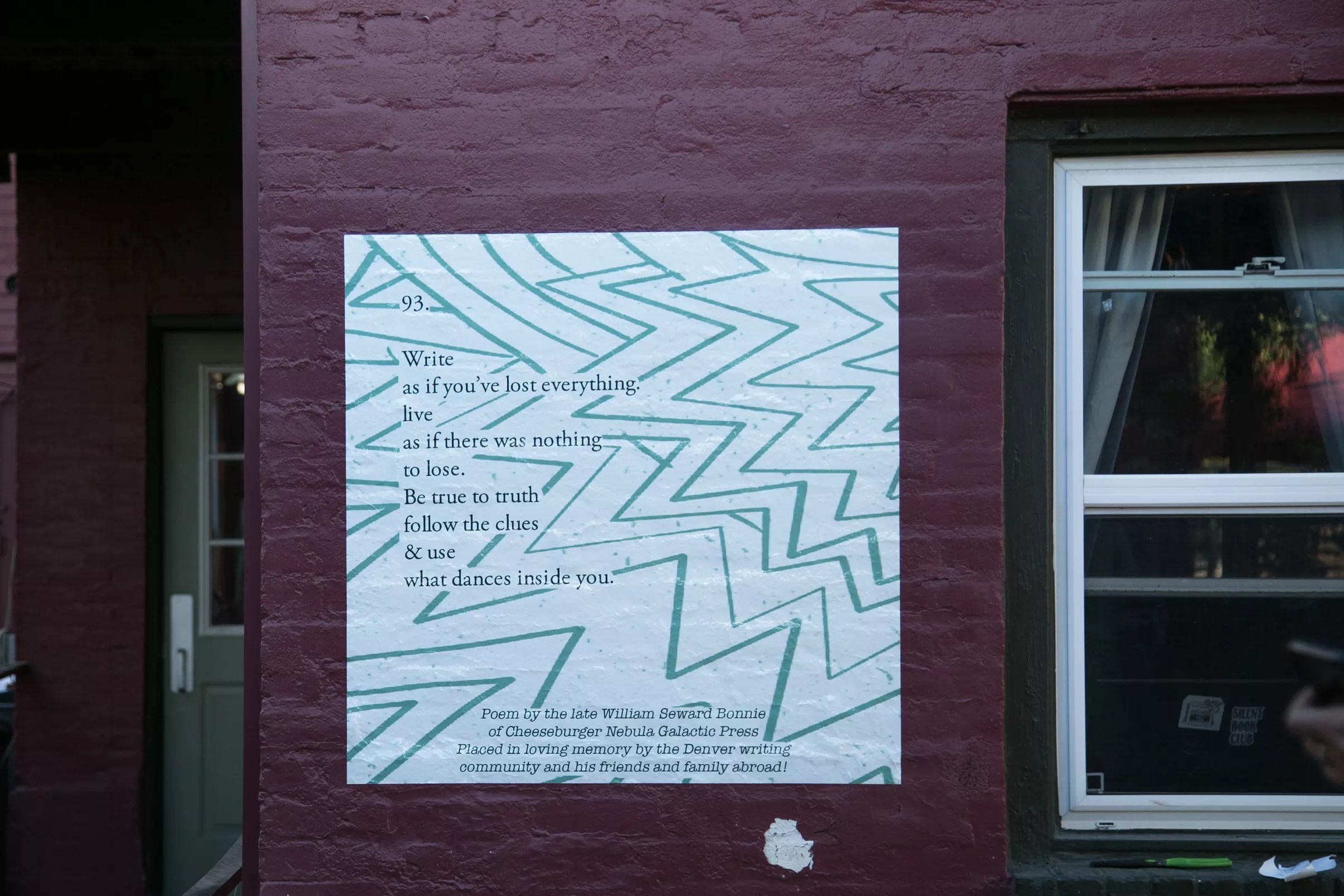 Three three-by-three-foot vinyl stickers, each with a different poem written by Bonnie, were placed at BookBar, Hooked on Colfax and Mutiny Information Cafe. The effort was spearheaded and organized by zine publisher Spit Poet Publishing, with whom Bonnie collaborated.