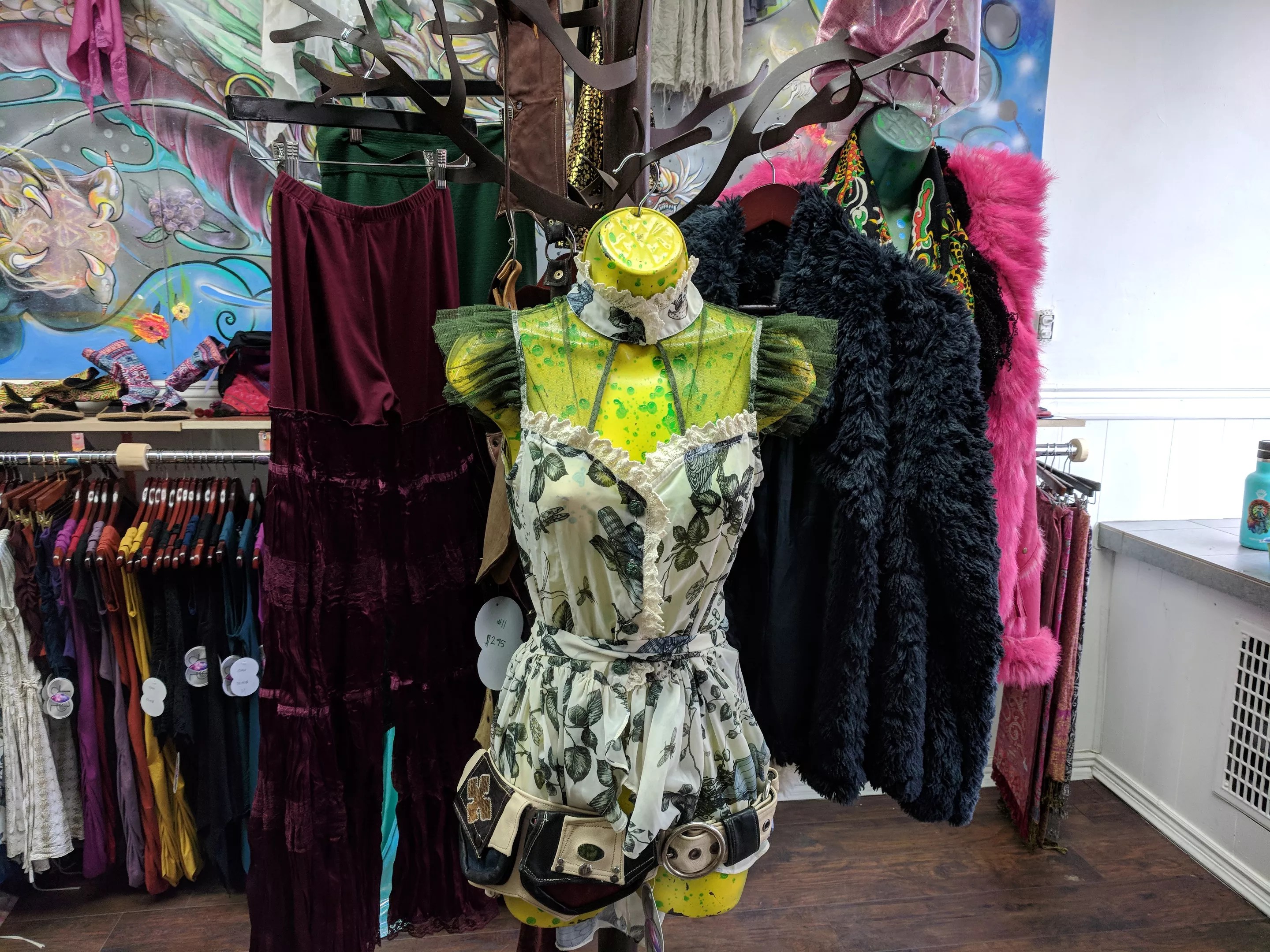 The fashion here is not for the timid or conservative; the designs are bold statements for innovative individuals. The store currently spotlights clothing by Patcha Play, Om Collection, Discerpo Necto Decrepitus, Amplified Elegance, Ankahsa Designs, Llama Sparkle Depot, Rachdiculous Designs and Re:treive, as well as accessories by Rad-wear Pocket belts, Geoddities, Darling Designs, Protozoa and Jucifer’s Toolbox Creations. “It was beautiful to watch all fourteen different artists come together to cultivate different parts of the store,” Taenzer says. “We were here vibing and enjoying bringing something new to the world.”