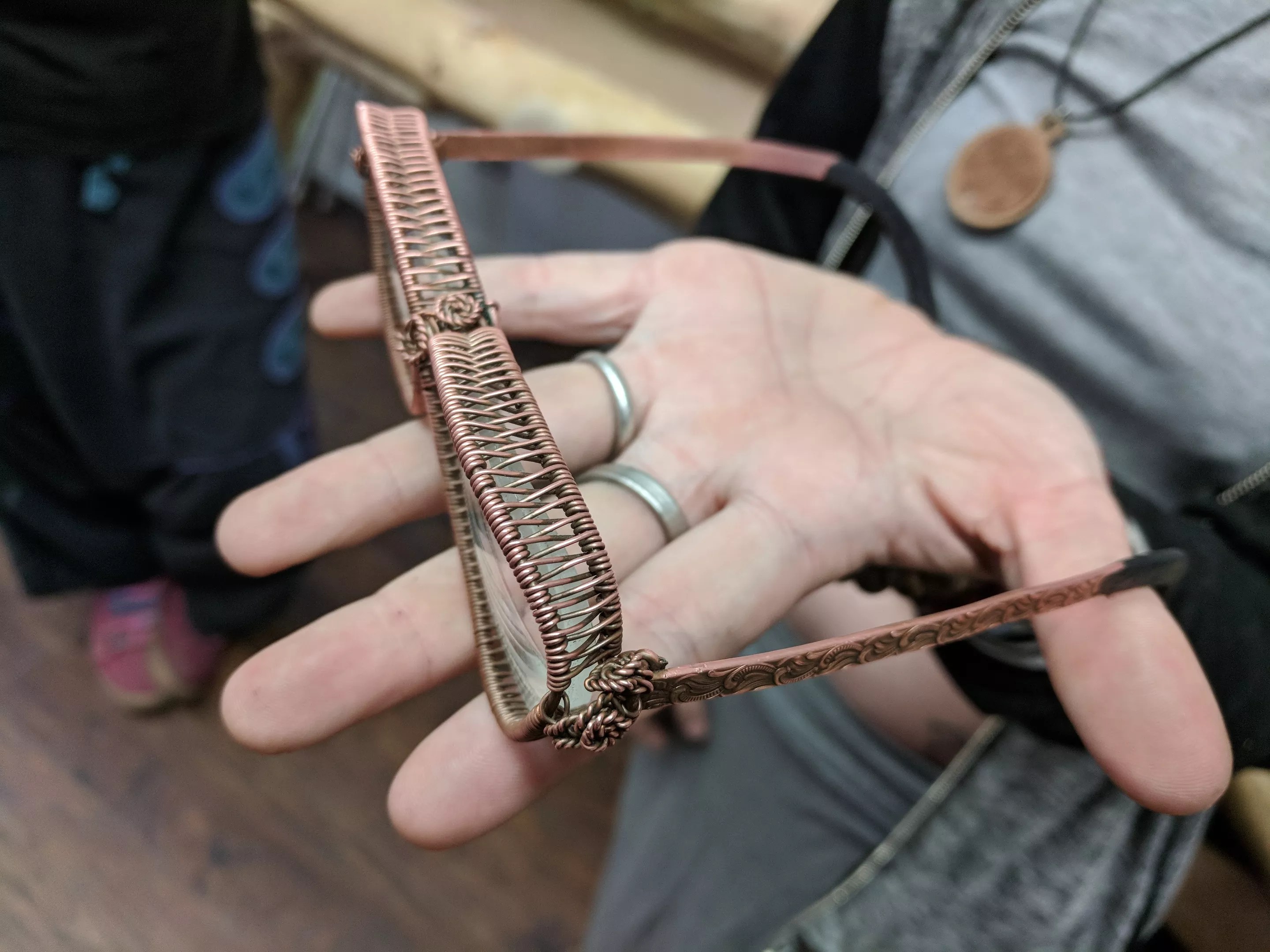 I am actually a jewelry designer. I do wire-wrapping and some fabrication work. I am also a unique clothing costume designer. I only do one costume production at a time, a three-piece or four-piece costume for a performance.