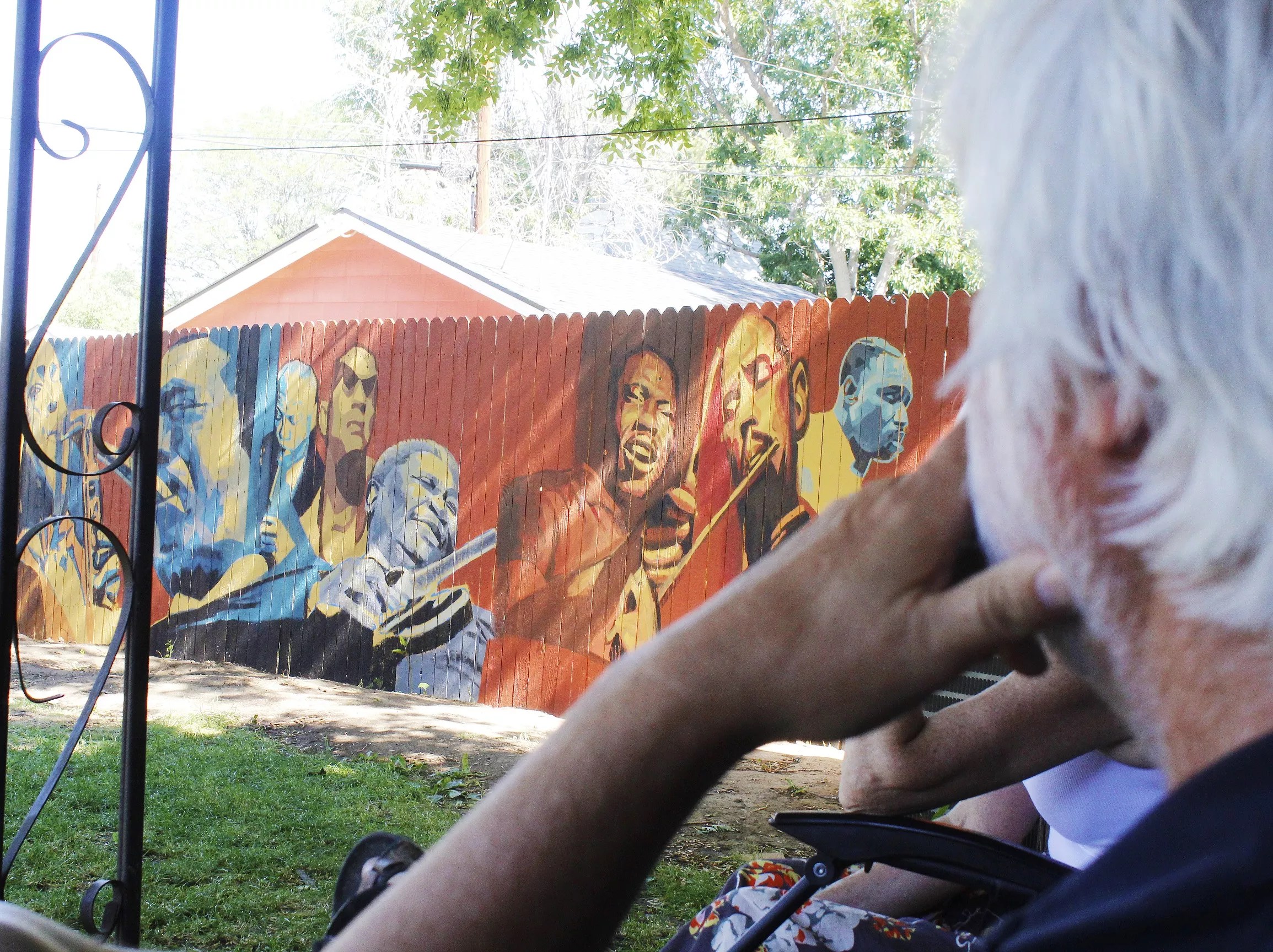 On a cedar fence in Englewood, the blues great B.B. King grooves on Lucille. He is joined on the left by Sidney Bechet and Sonny Rollins – the only living artist depicted on the wall. On the right are drummer Elwin Jones and flutist Eric Dolphy.
