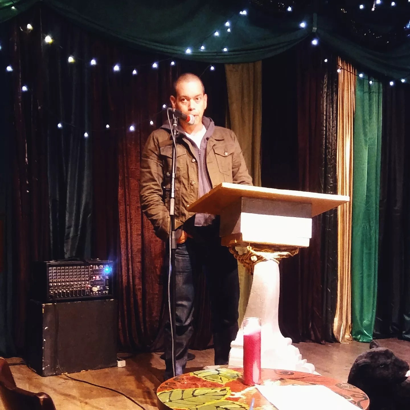 Jay Halsey at the mic for an Fbomb reading.
