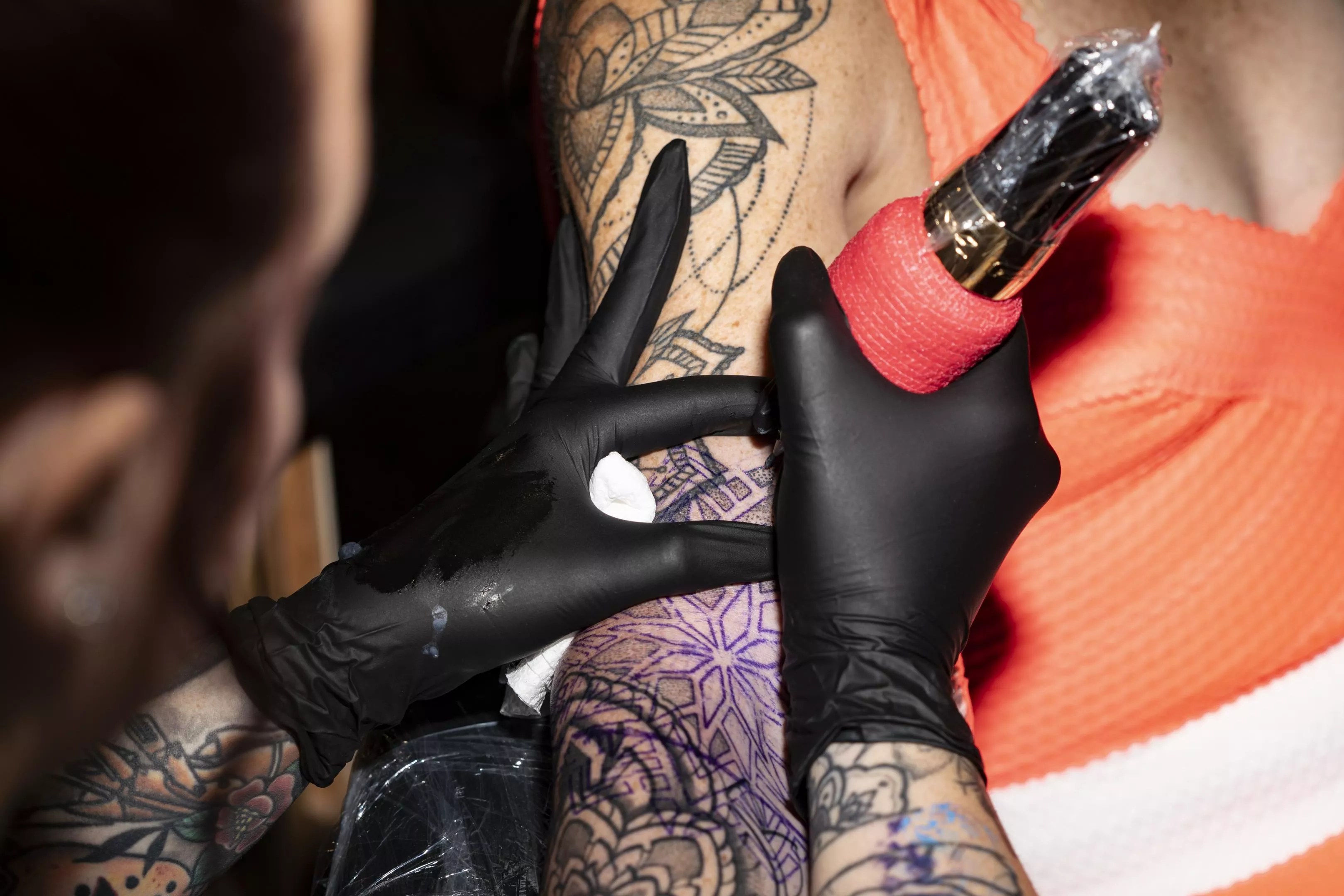 Maddy Visser finds the right placement for Stacy Gill’s new tattoo. Gill is from the Loveland area and has mandala tattoos from various artists.