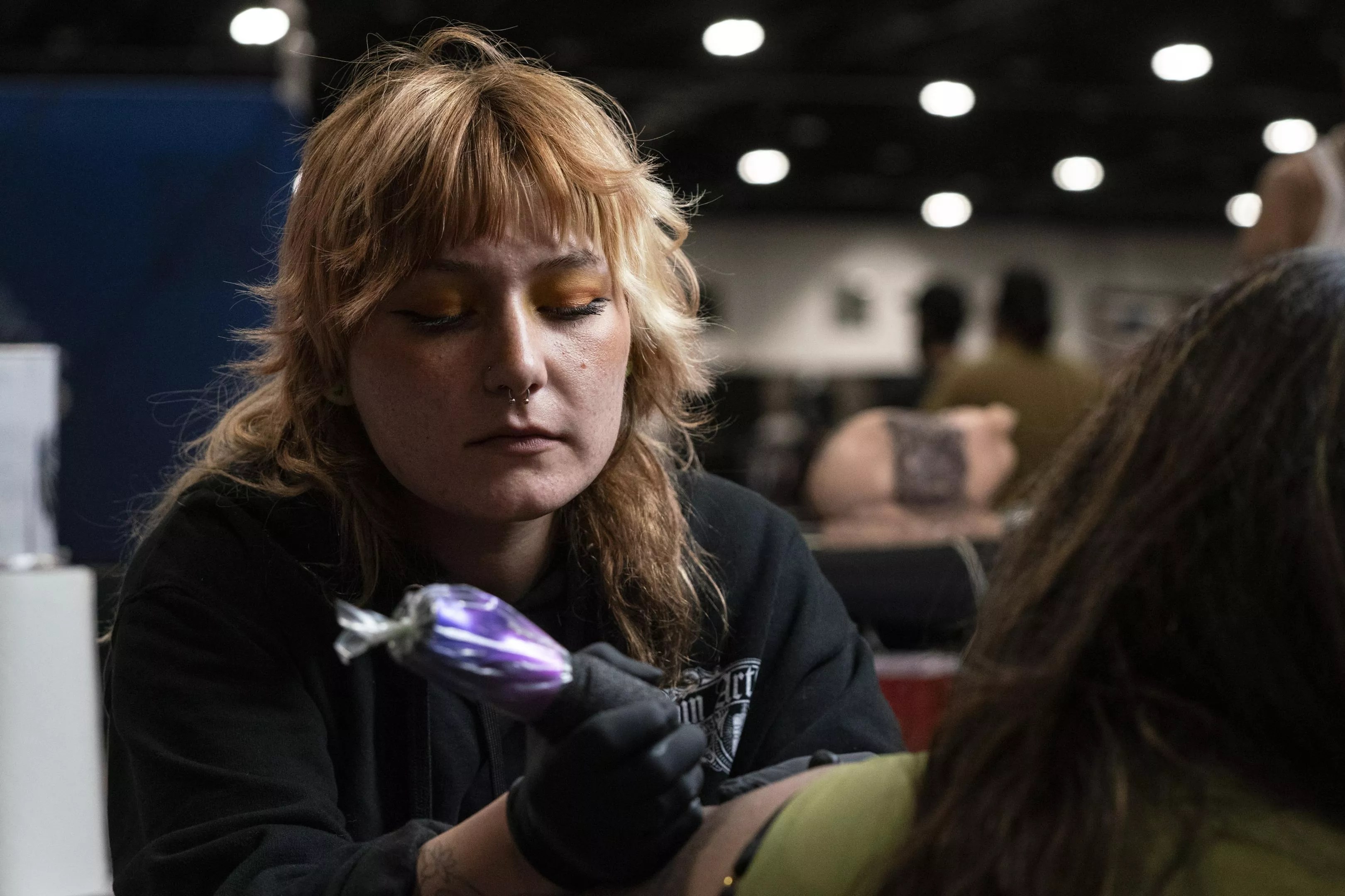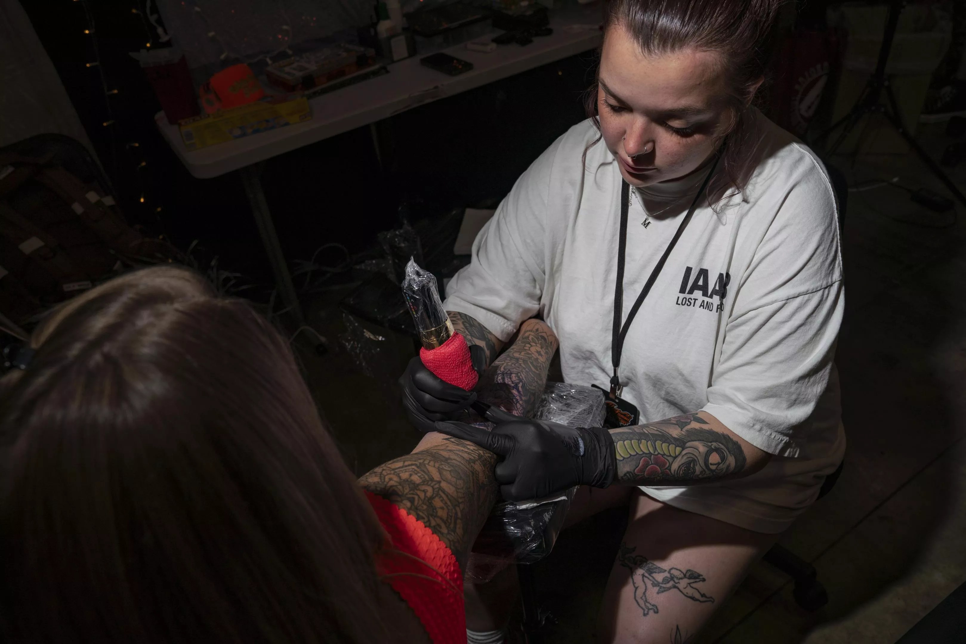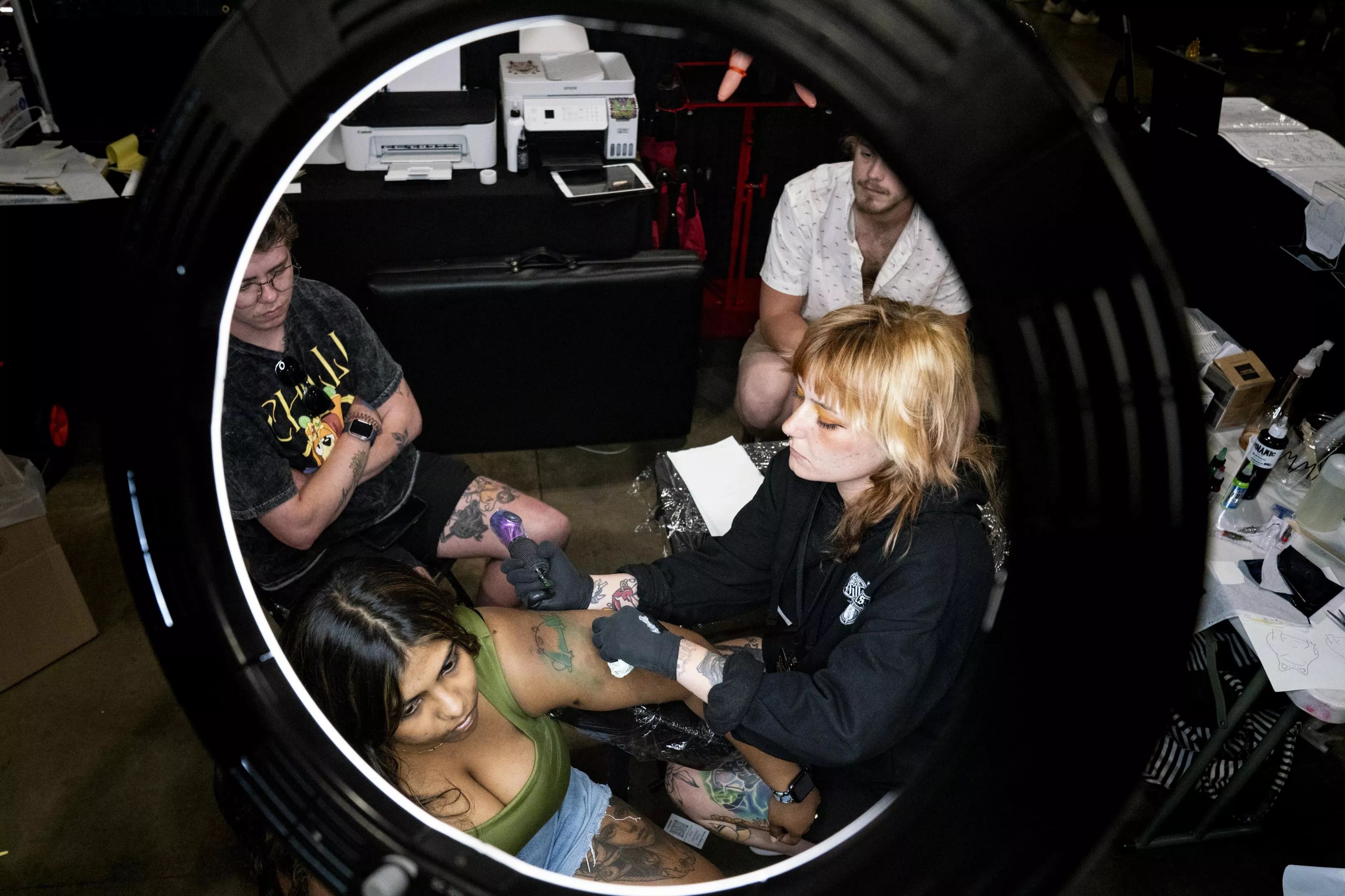 Cameron Edwards gets a tattoo by Malachi Green as people walk through the rows of hundreds of tattoo artists.