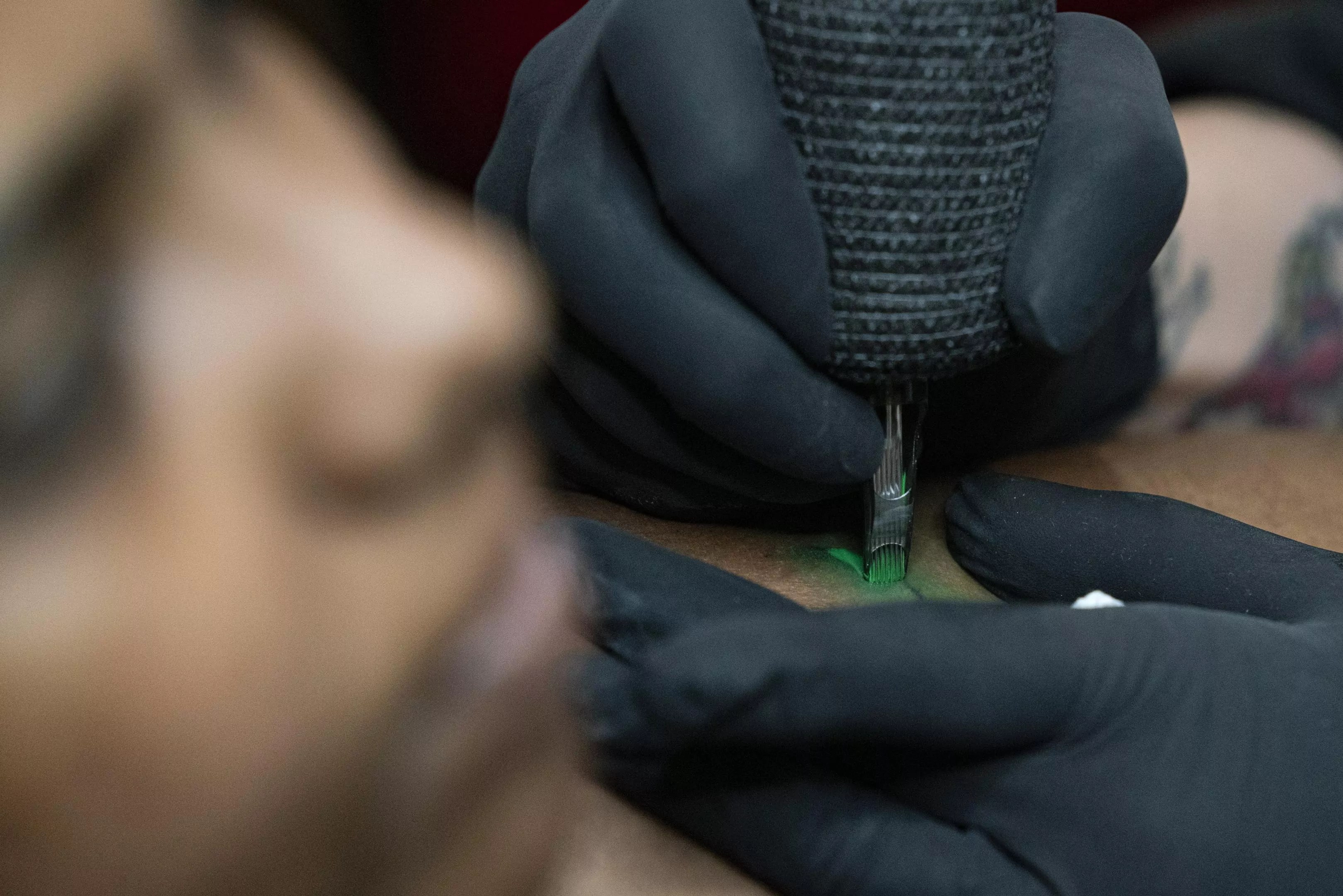 Tattoo artist Malachi Green focuses on his art while tattooing his client Cameron Edwards.
