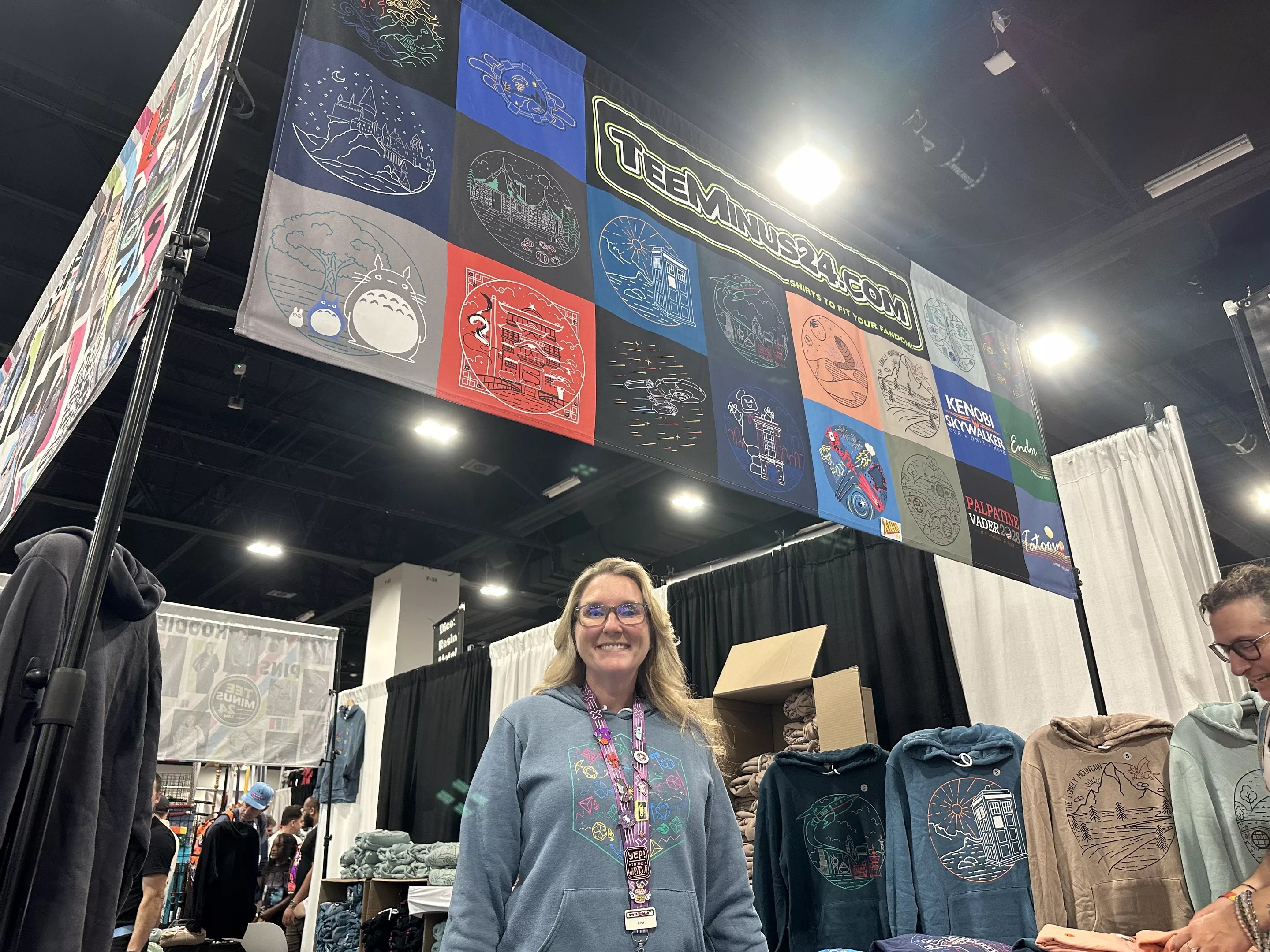 One of the interesting trends at the convention — and one of the most gratifying — was the apparent influx of more original creators. While the old bulk retailers are still there with the same X-Men shirt you can find pretty easily at any number of webstores, Lisa (pictured) and her husband Vincent run TeeMinus24, selling nerd-celebrating art designed in-house by Lisa herself. Want a travel tee from Dagobah? A hobbit home from the Shire? A TARDIS or a Totoro? Here’s where you can nerd out…uniquely.