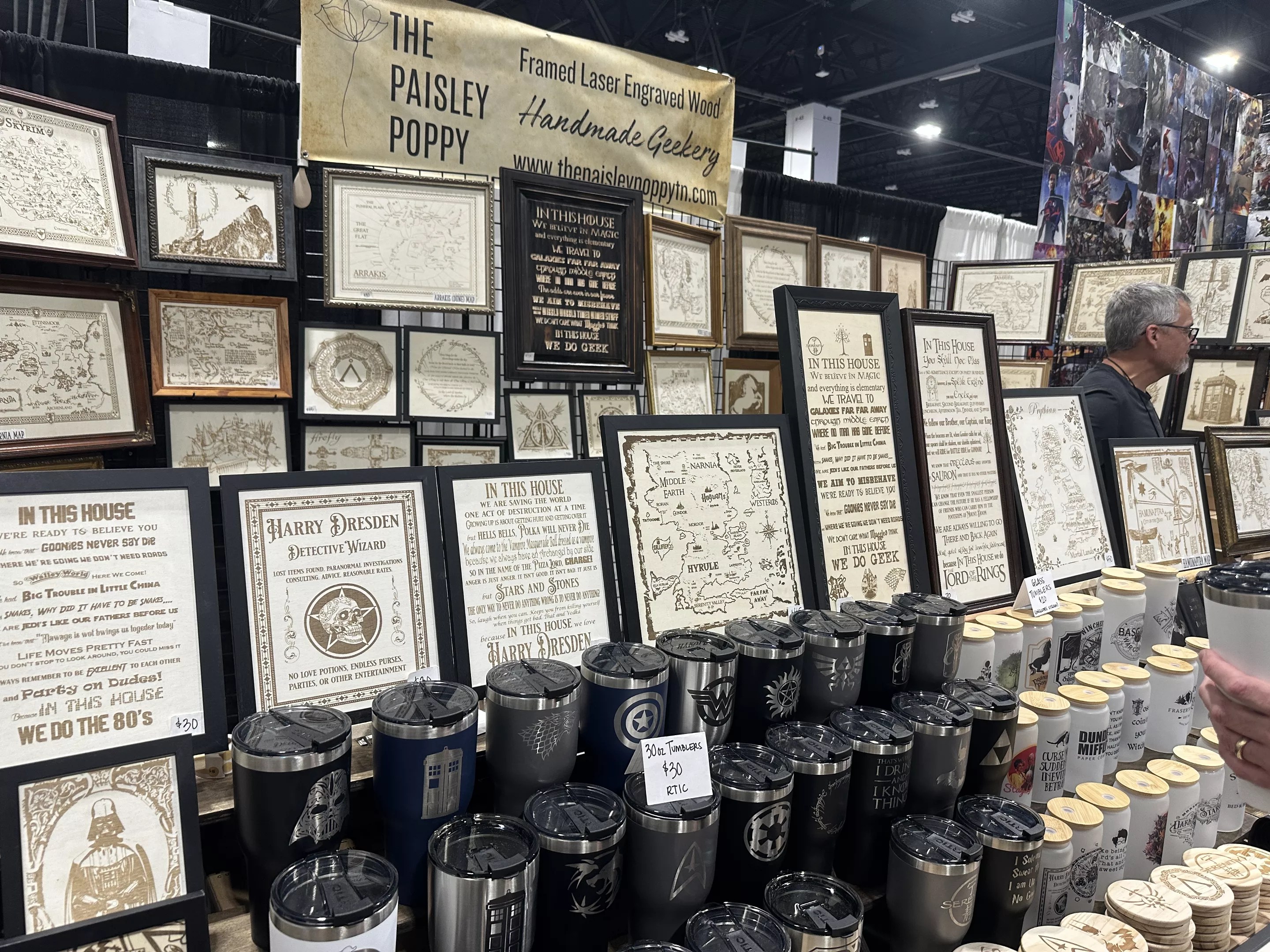 If you love nerd minutiae and know who Albrecht Dürer was, then this is the booth for you. Etchings, etchings, everywhere, and not a drop of ink. Who needs it, when you’ve got a precision laser and a solid creative spark? The Paisley Poppy doesn’t carry only framed laser-engraved wood products featuring fan-favorite properties from film, books, gaming, and more, but that’s the lion’s share of their stuff, and what draws the eye. And, one is to hope, the pocketbook.
