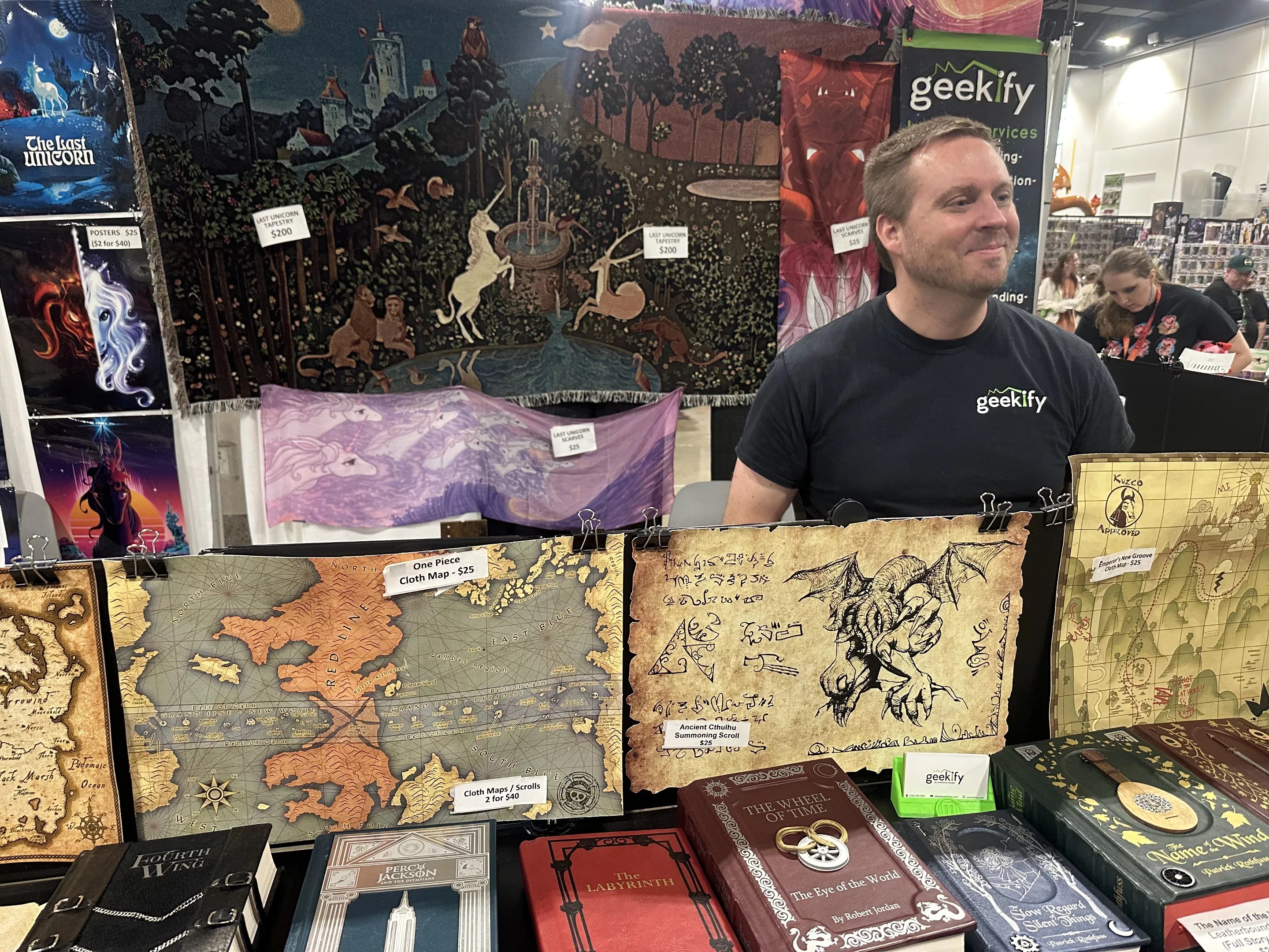 Another local vendor is John Taylor (pictured), owner of Geekify, which focuses on “quality handcrafted products for the discerning geek.” (And really, aren’t all geeks pretty damn discerning?) A lot of what the store carries are pieces that were originally custom requests from fans (something they still offer). Cloth maps of fantasy realms. Leather-bound custom treatments for favorite novels. That blanket tapestry of The Last Unicorn in the background of the photo above. Taylor describes his company as “what happens when an Etsy store grows up,” which is to say he more or less is living the American dream: start small, follow your passion and grow a business of which you can be proud. On a U.S. holiday weekend? Something to celebrate.