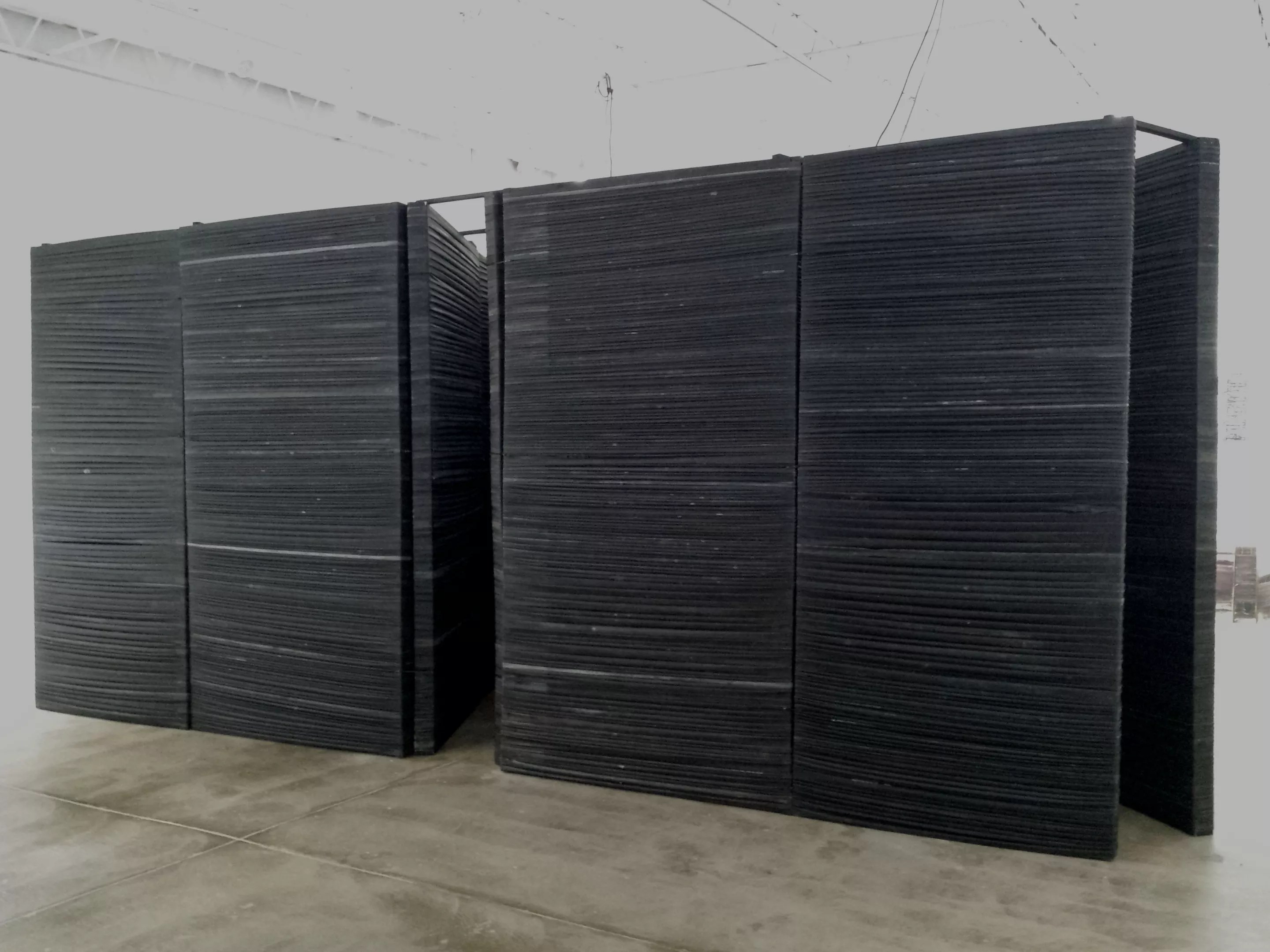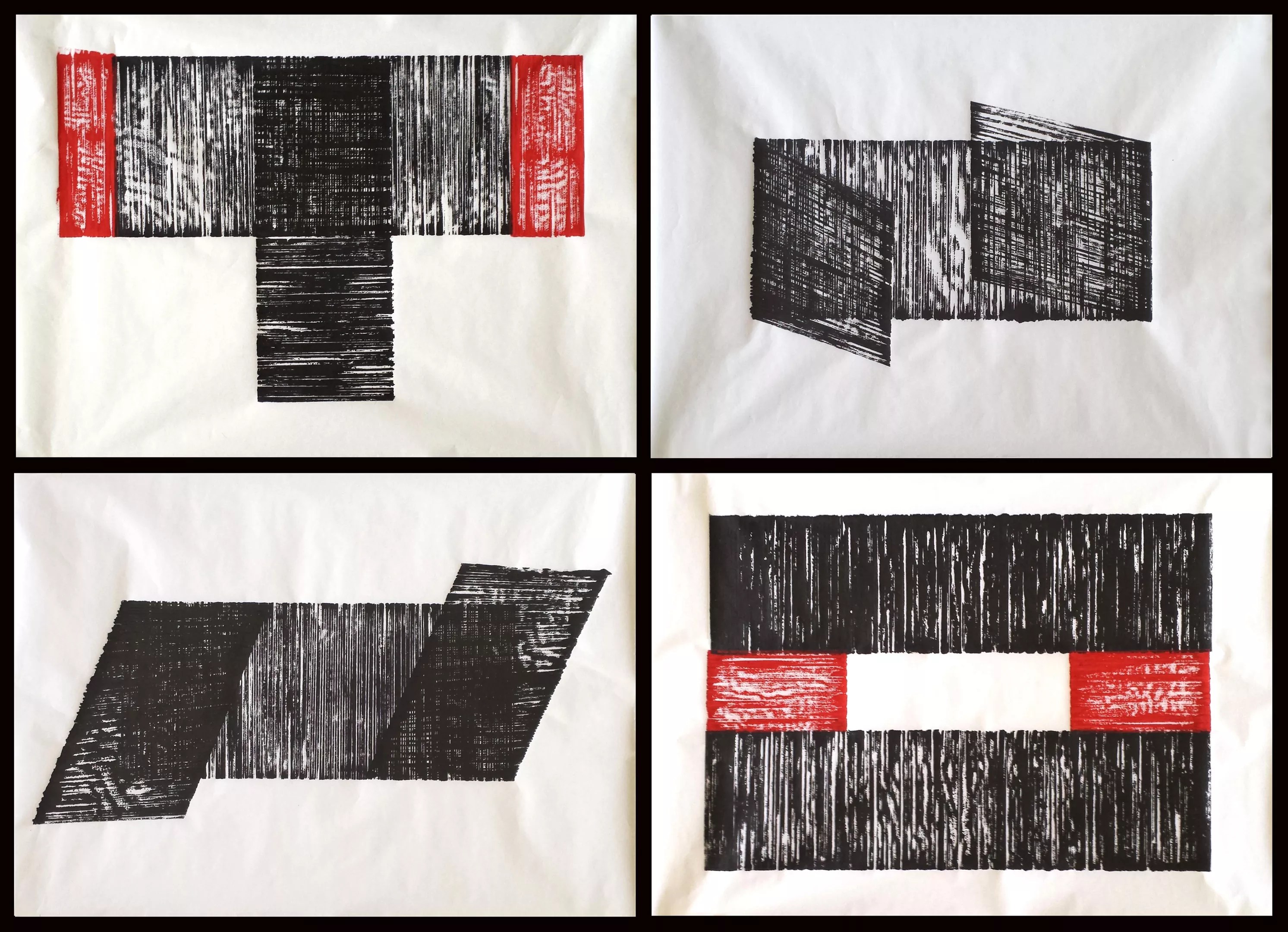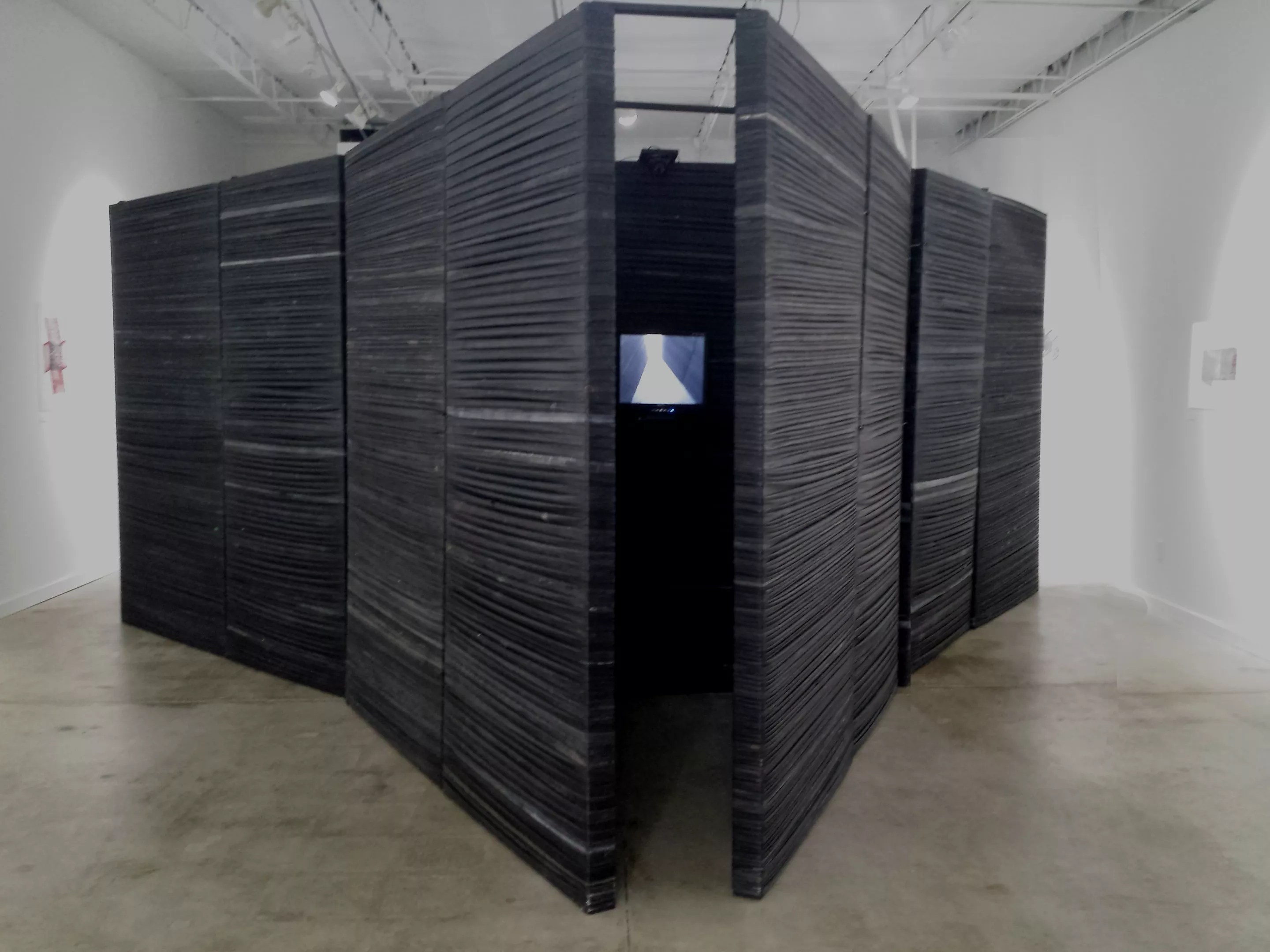 The main event is the member show: Quantum: Charles Livingston. During the last couple of years, Charles Livingston has emerged as a key player among the Pirate members; he found the new place and oversaw he rehab. For his room-sized installation, called “Sensory Pod,” Livingston built a wooden armature over which he stretched old bicycle inner tubes as though they were giant rubber bands; they form the walls of four chambers within a structure that has an overall triangular footprint. Access to these chambers is through slits in the walls (one of the openings is too narrow for most viewers to get through, though the others are not as slim). Inside, on the facing wall, there’s a video monitor, and above it, a security camera aimed at the space. The monitor shows the image from a camera capturing the view of a different space. On the walls surrounding the installation are works on paper: simple geometric compositions done using scraps of wood left over from the project as printing blocks. I’m not sure what Livingston means by it all, but the work is captivating and very elegant.