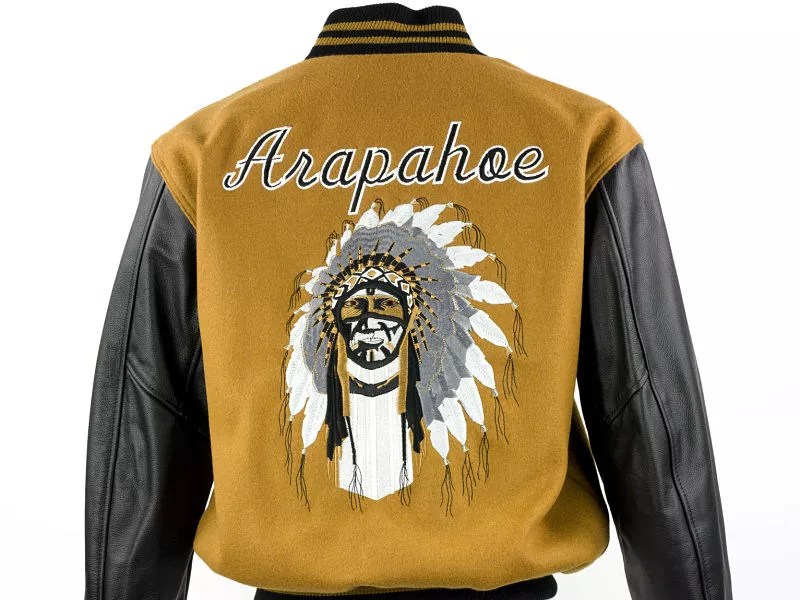 Strasburg High School chose that route. For decades, the school had called itself the “Home of the Indians,” but members of the Northern Arapaho tribe, which once roamed this area an hour east of Denver, didn’t appreciate the stereotypical depiction of the warrior the school used as its mascot. Working with tribal representatives, the school was able to come up with a solution, making subtle changes not just to the image, but to the school’s culture. In doing so, it followed the path taken by Arapahoe High School in Centennial decades before. In the early ’90s, that school worked with tribal reps to come up with an image for its Warrior mascot designed by Northern Arapaho artist Wilbur Antelope; one of the school’s jackets is part of History Colorado’s Zoom In: The Centennial State in 100 Objects exhibit.