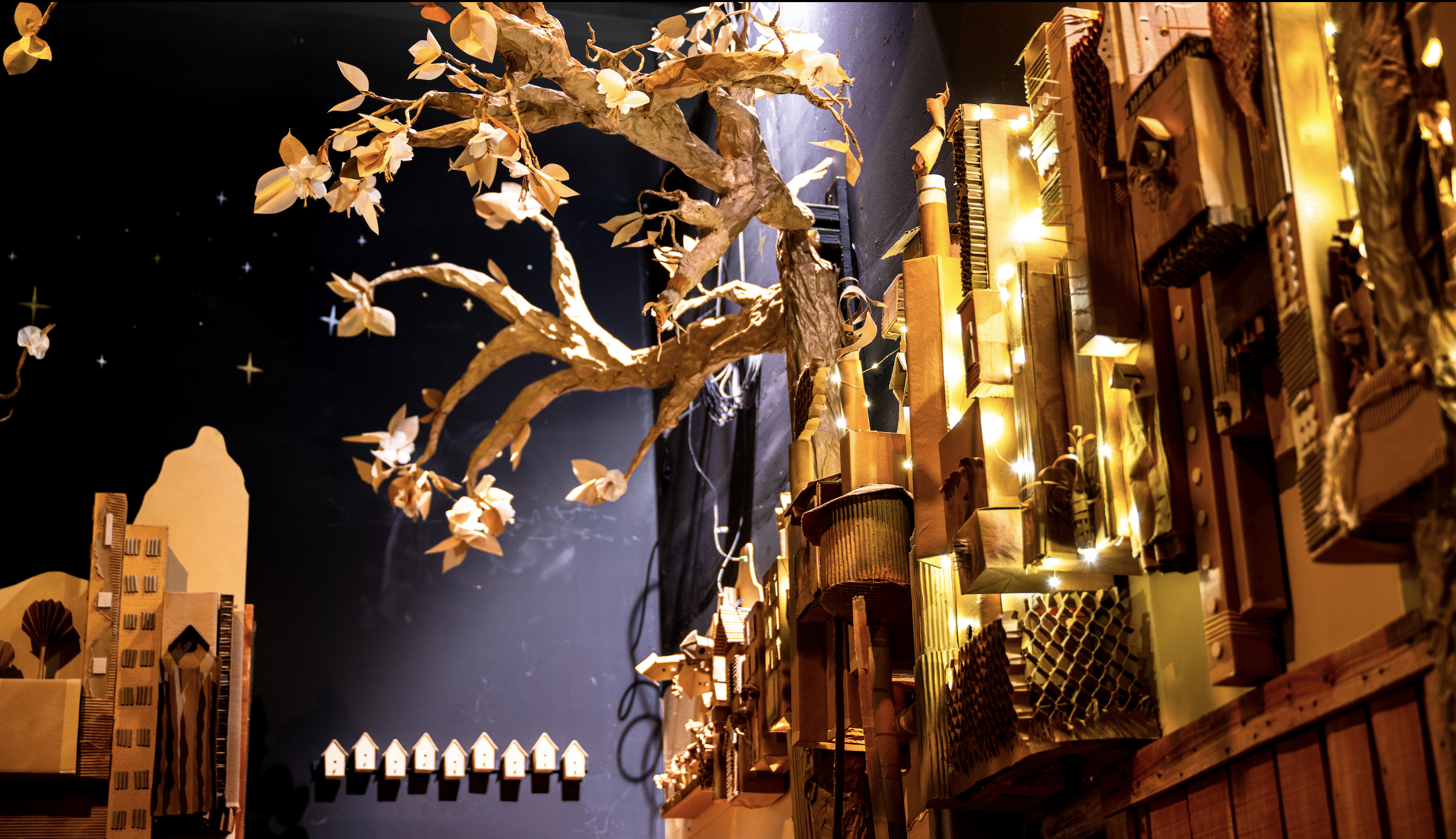 “And then it’s: What would a natural, mythical creature think of some of these man-made concepts?” Mosquera adds. “So the cardboard room, for instance, is an exploration of man-made crates and boxes. And he’s a Yeti who lives in the woods, so that’s a weird concept for him.” The cardboard art, shown in the Curiosity space, depicts a city of birds, illustrating the idea of blending the created and natural worlds.