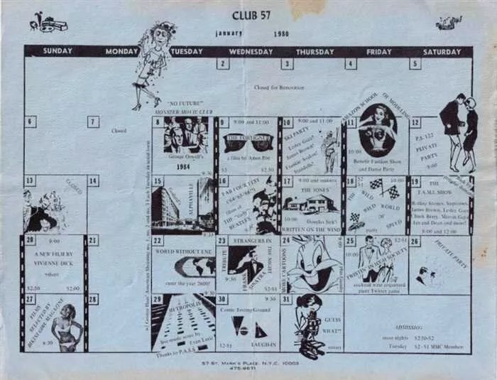 Club 57, event calendar for January 1980, 57 St. Mark’s Place (blue paper stock).