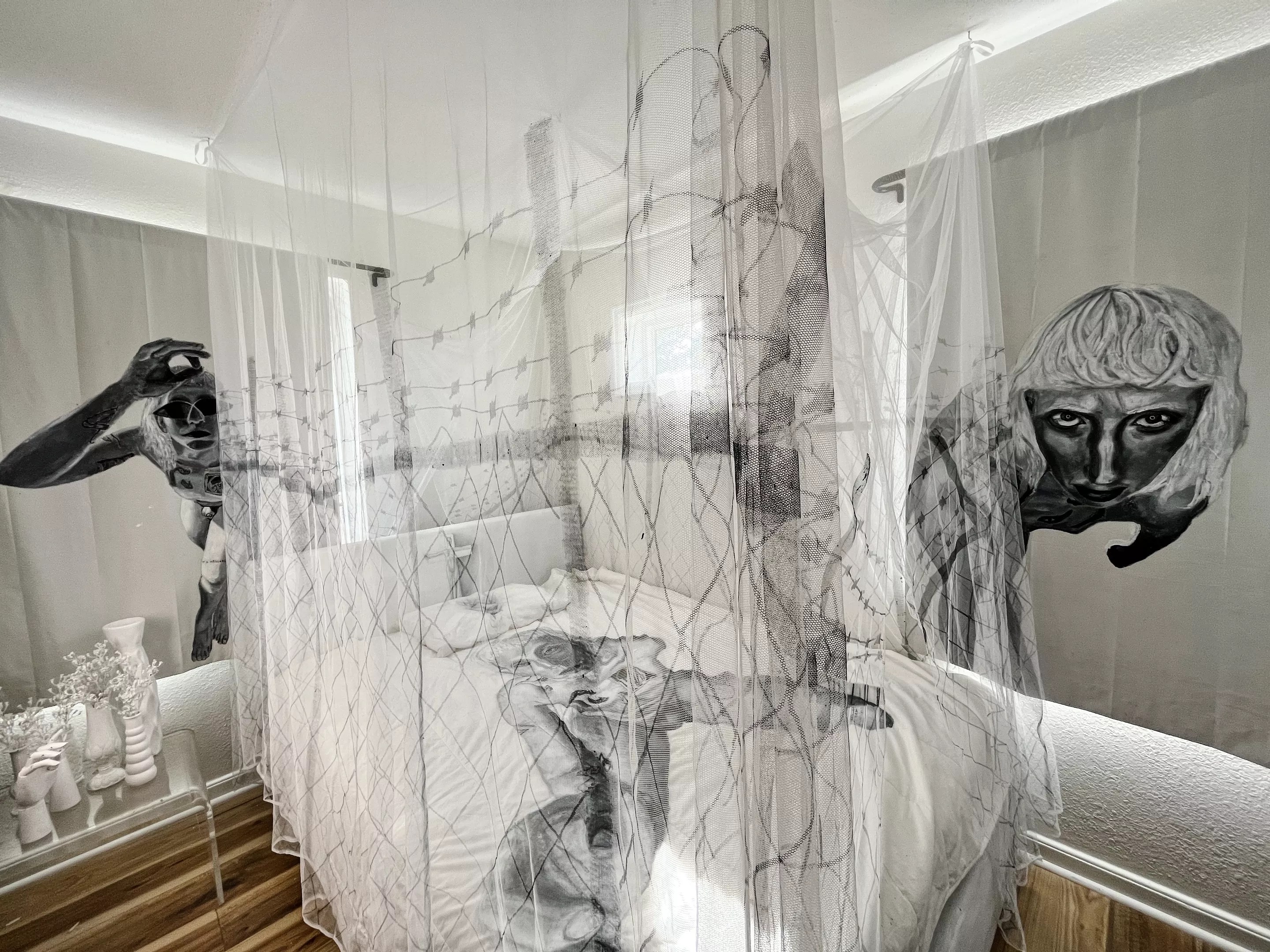 For the exhibit, Smith created “Withdrawal,” a ghostly, impactful installation. A bed is encircled by a netted canopy with lightly painted chain-link fencing and barbed wire; a grayscale portrait of Smith is painted on otherwise pristine white sheets, and the pillow is imprinted with the depression of a face, as if someone had buried their face in it. Drapes are painted with striking, confrontational portraits that appear to be diving from the windows into the room.