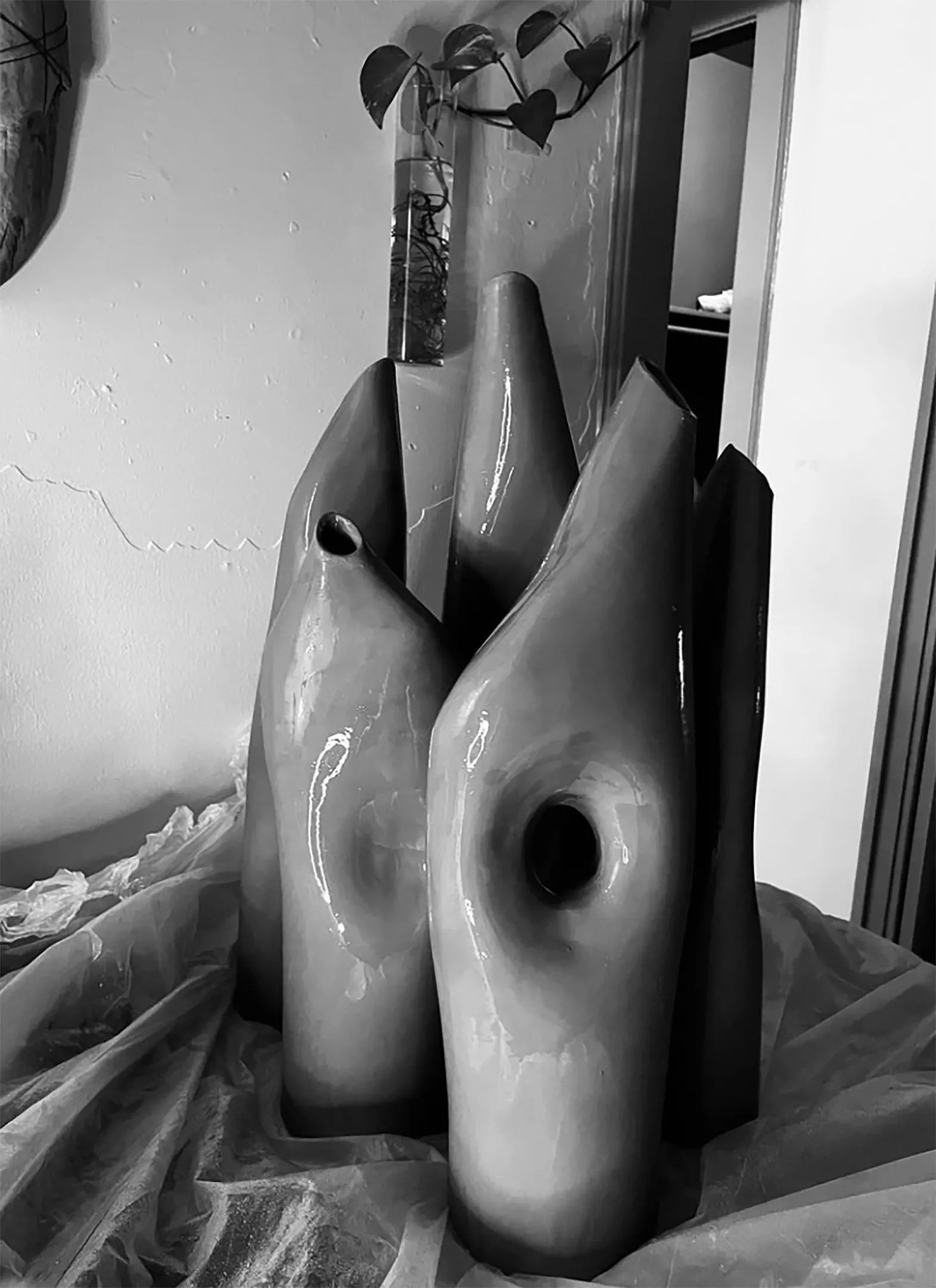 One of Bollag-Miller’s pieces displays her own idea of sanctuary: fashion. “I’m sort of focusing on this idea of euphoric futurism and personalizing sculptural costume design with specific people’s narratives on their experiences with euphoria,” she says. “I’m using it as an opportunity to build an installation that is also wearable to create an atmosphere of sanctuary.”