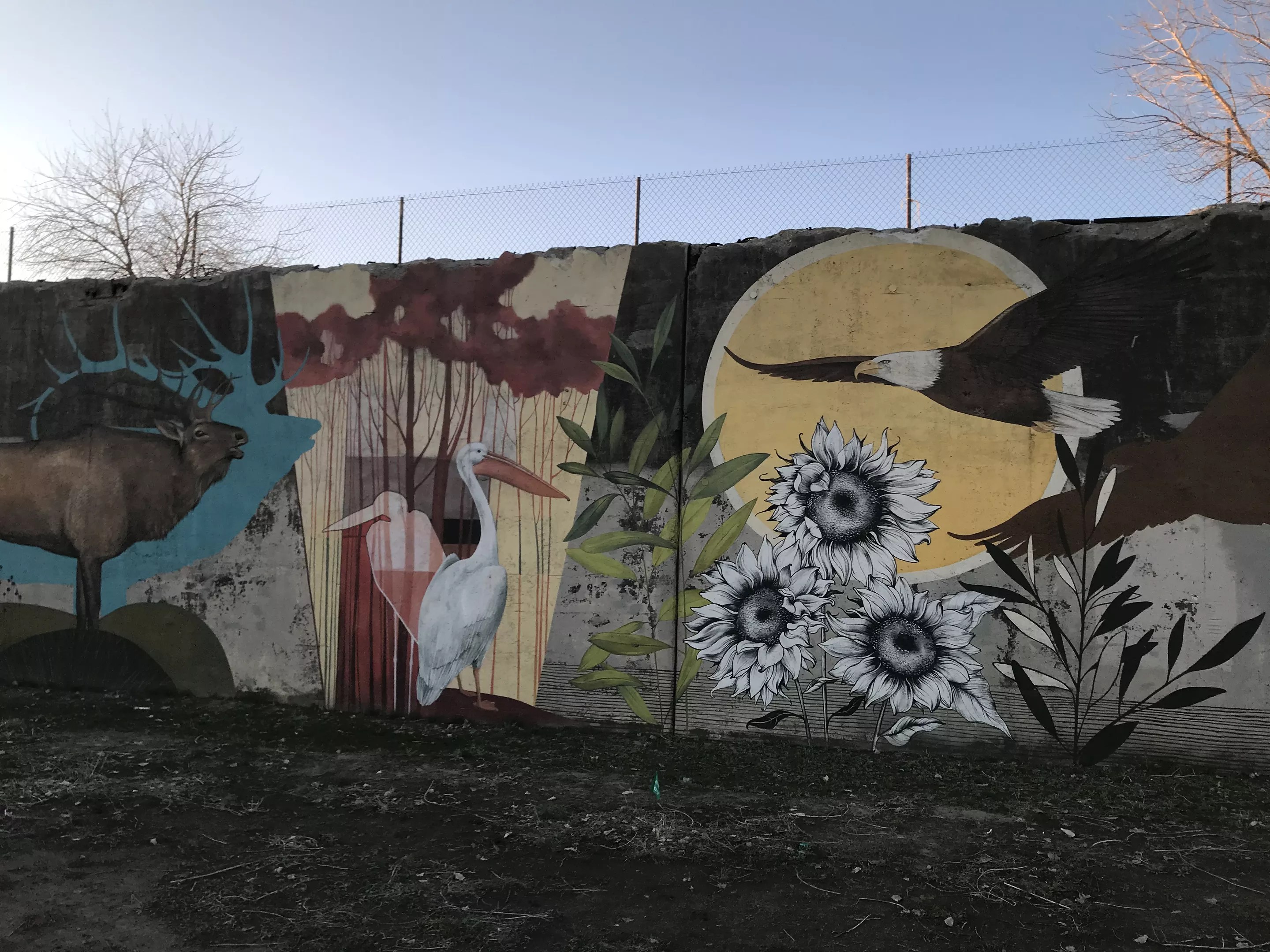 A jaw-dropping, colorful mural depicting flora and fauna from the region rises 13 feet high and stretches along 275 feet of the wall. This was the first commissioned mural on the trail, and was paid for by the Sand Creek Regional Partnership.