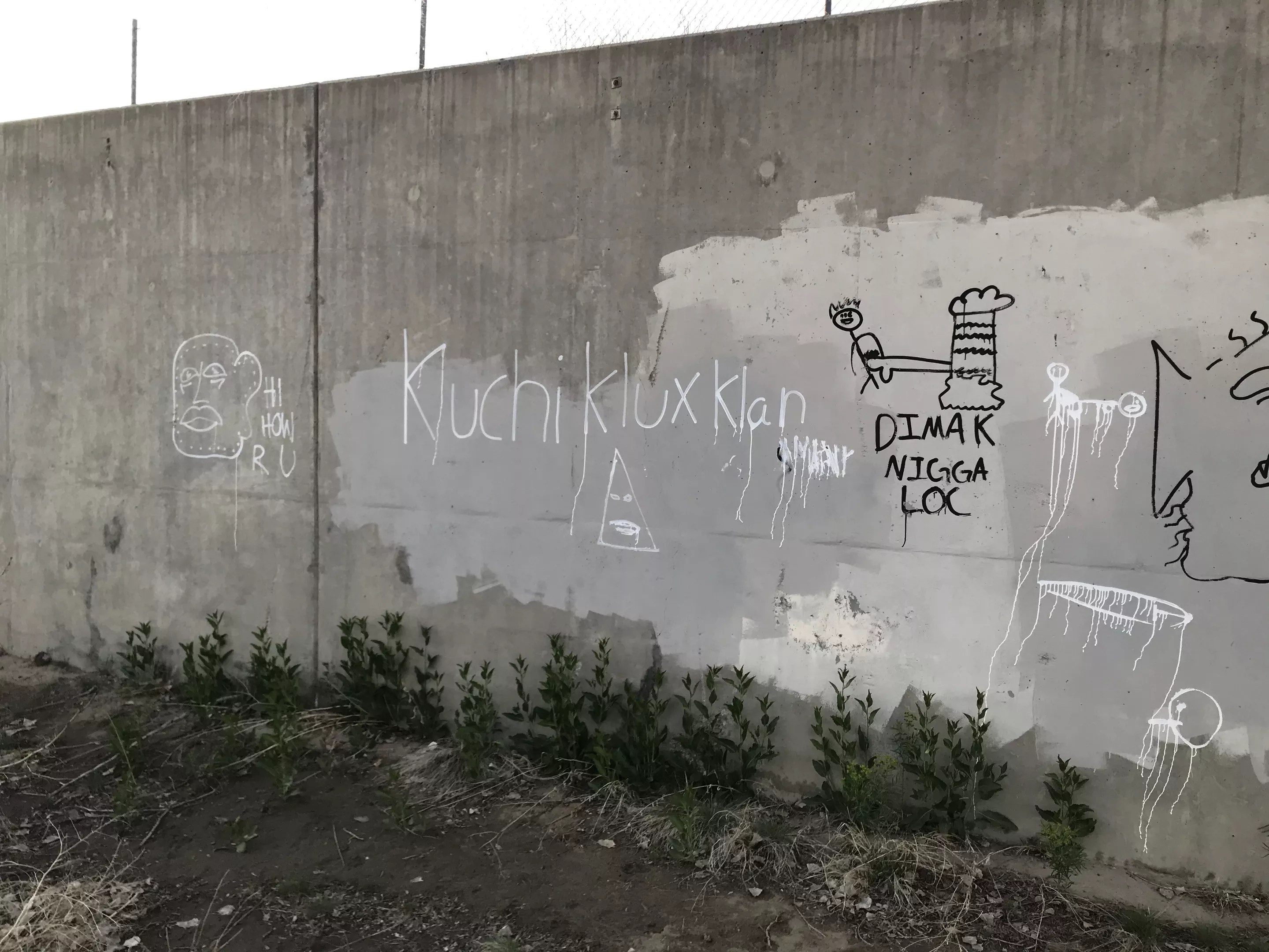 Poorly executed racist and crass graffiti along the Sand Creek Regional Greenway.