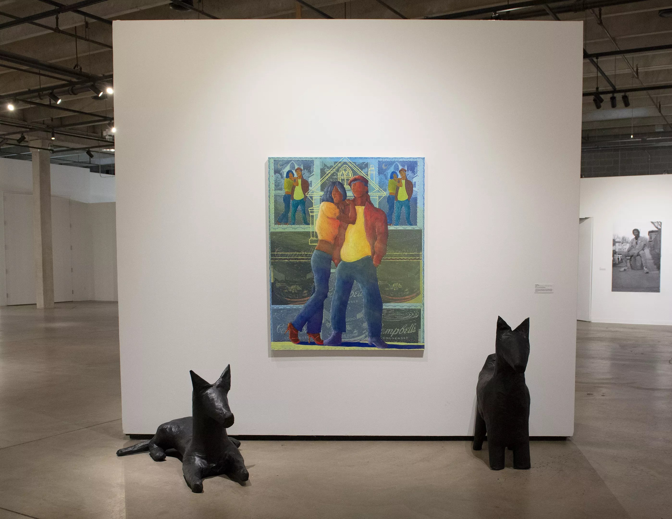 Opposite Garcia’s piece, Tony Ortega has used one side of a similar wall for a painting of a 1970s Chicano couple rendered in his signature style. Behind them is an outline of a little north Denver house and, behind that, a trio of smaller, similar portraits of the couple. In front of the painting, on both sides, Ortega has placed sculptures of guardian animals – dogs? – done in black papier m’ché. The old Northside was once the heart of the barrio, but it’s now being filled with affluent whites, so the topic is again gentrification: The dreams of the young couple from a generation ago are unattainable for their children.