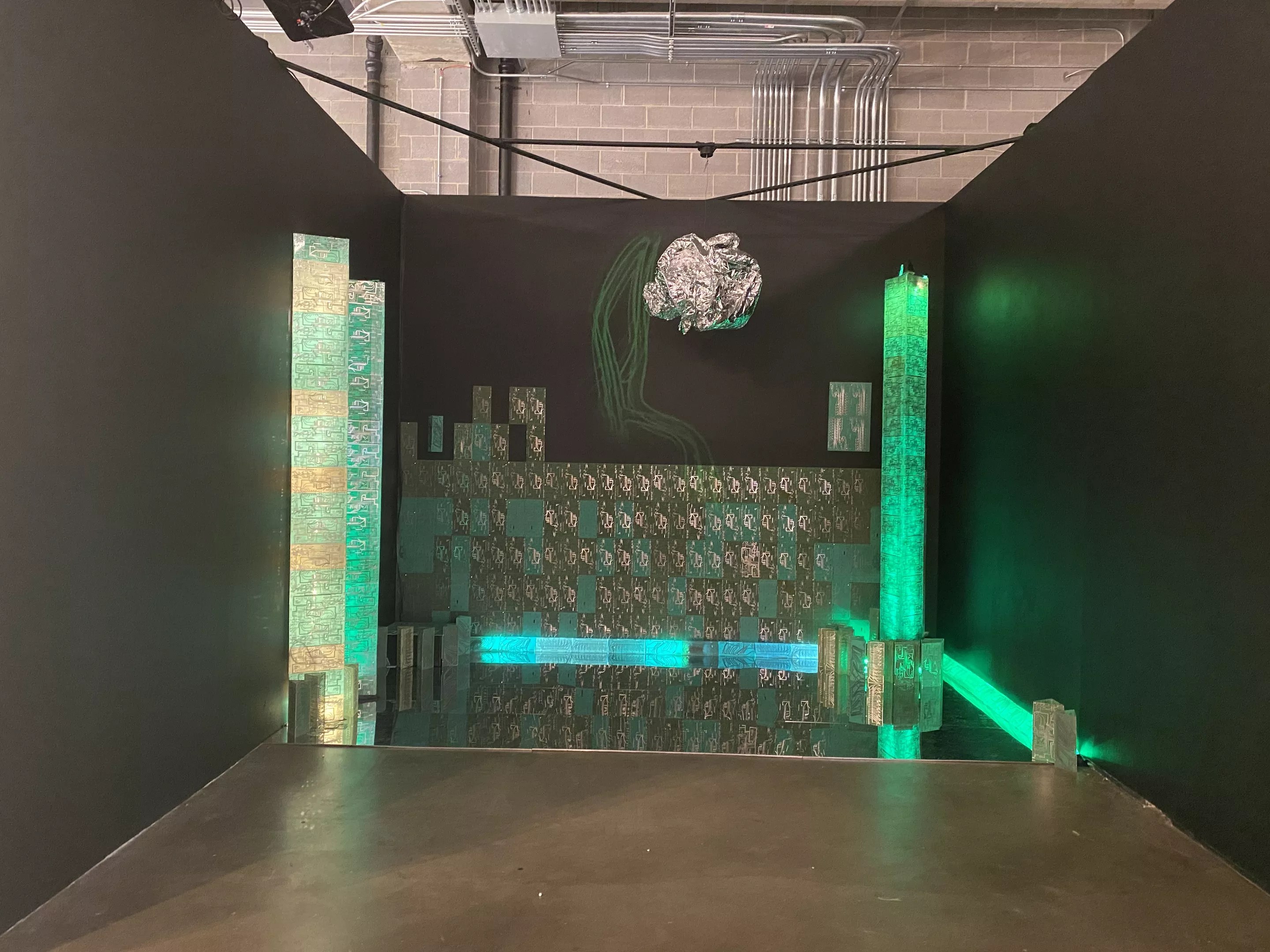 No artist takes the “future” implication of Afrofuturism more to heart than Chris Bagley, whose “Circuit City” is a cross between the interior of a sacred space and that of a nightclub. This piece, which is meant to conjure up some future metropolis, fills an entire small gallery at the back of RedLine. Bagley has covered the floor with shiny reflective panels and, hanging above, a crumbled Mylar blanket rotates like a deformed disco ball. On either side are internally lit columns made of circuit boards, and there are other lighted elements, too. On the back wall is a movement-activated video projection, in which those interacting with it are reduced to flattened blobs with no discernible features. For Bagley, the unrecognizable shadows of figures suggest a time when appearances will be replaced by actions.