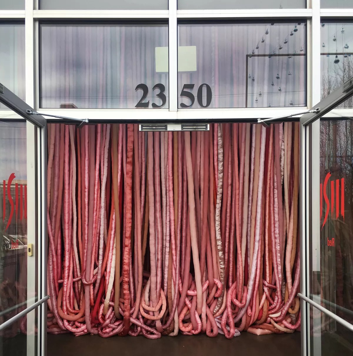 To mark this milestone, RedLine is presenting 10X: RedLine, a spectacular exhibit highlighting the artists who have been its residents. The show, which opens on February 2, will not only fill the galleries, but will spill outside into the forecourt and parking lot. When I went through last week, it was still getting its finishing touches, and there, in the lobby space, I spotted RedLine founder Laura Merage working on her gigantic “Nausy Nauzy” installation. The piece, made of felt-covered foam pillows, chairs and poofs, climbs the back wall and covers the floor below. For Merage, it’s meant to provide comfort “in uncomfortable times,” she says with a laugh, and viewers are supposed to interact with the elements, lounging on the pillows or moving them, sitting on the chairs and poofs.