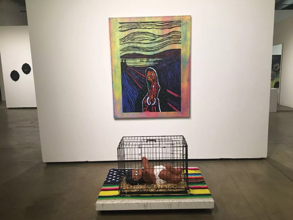 Although several works are overtly political, Tony Ortega‘s is the most emphatic, taking on the topic of children separated from their parents at the border. Using materials associated with Mexico, including papier-m’ché, straw and a serape, he creates a scene in which an image of Our Lady of Guadalupe inserted into Edvard Munch’s “Scream” hangs above a Christ child lying on a bed of straw, held within a metal cage. It’s very powerful. Though not as overt, Clay Hawkley‘s two spray paint on prints and an accompanying suspension piece seem to take on the idea of toxic masculinity, though his statement talks only about competition and domination in a value-neutral way. The prints, one predominantly black, the other white, are mandalas that comprise photos of football jerseys, complete with their numbers; off to one side is a steel pole on which Hawkley has attached little picture magnets. The images on the magnets comment on the jersey prints, showing fans who have painted their naked torsos in team colors. A d Robert Delaney