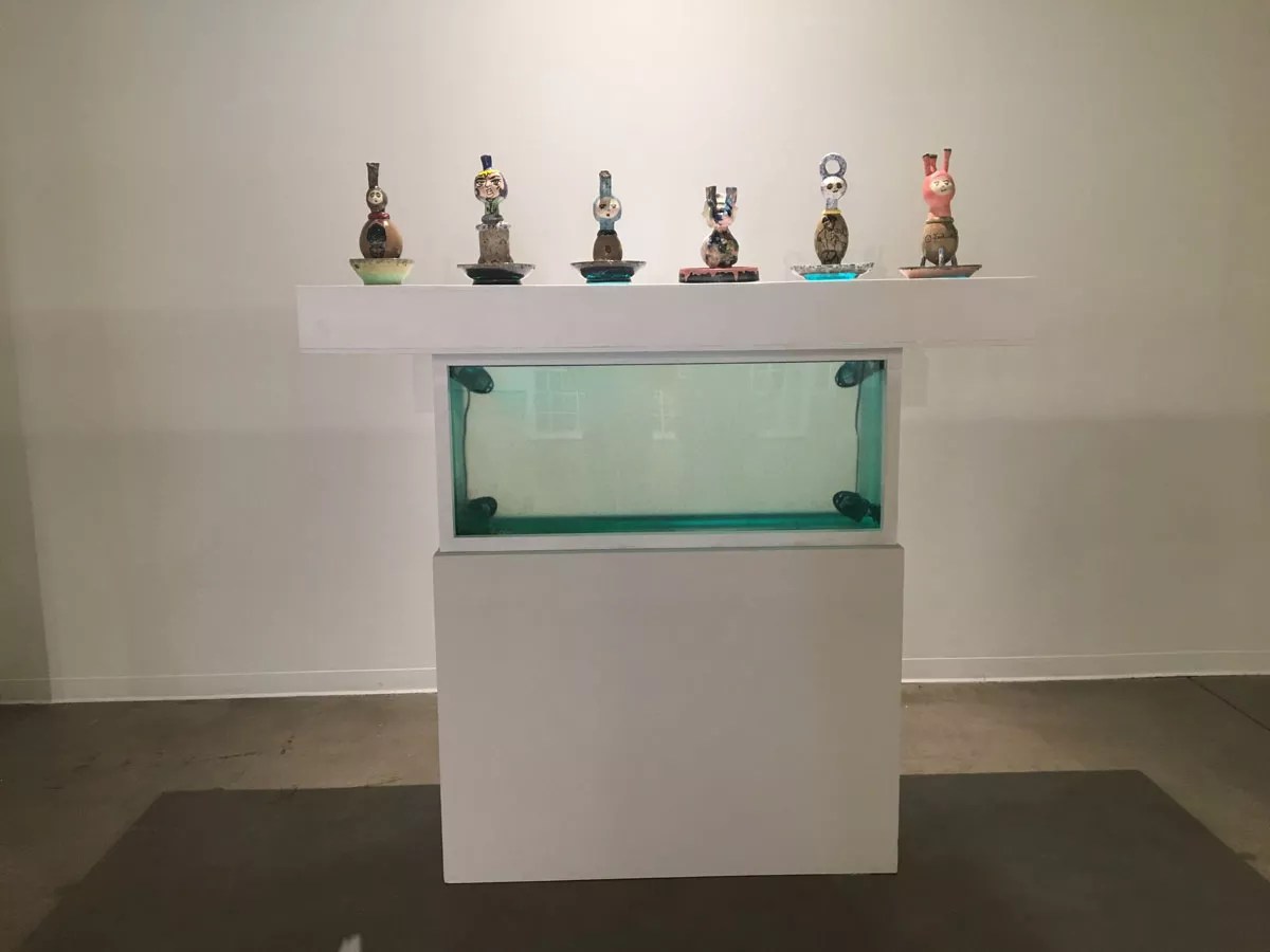 Across the room is a piece that could be an heir to Parson’s, at least aesthetically, because it’s sort of industrial, too: Trey Duvall‘s collection of aquariums on legs, each with a lighted work lamp submerged inside. The danger of electricity in water immediately comes to mind, but at the same time, the piece is an elegant post-minimal installation. Oddly enough, other works in the exhibit also address the idea of submersion. Akin to the lamps-in-fish-tanks, though the components more closely resemble fish bowls, are the clear cast domes encasing daisies by Megan Gafford. Like Duvall, Gafford is looking at physics, with the flowers she’s encapsulated purposefully exposed to radiation. I don’t have any idea what Juntae TeeJay Hwang is getting at in his installation incorporating a big aquarium with constantly moving water, which is surmounted by a shelf with a lineup of weird little clay figures that look like cartoon renditions of outer-space aliens, but comprehensible or not, it’s stunning.