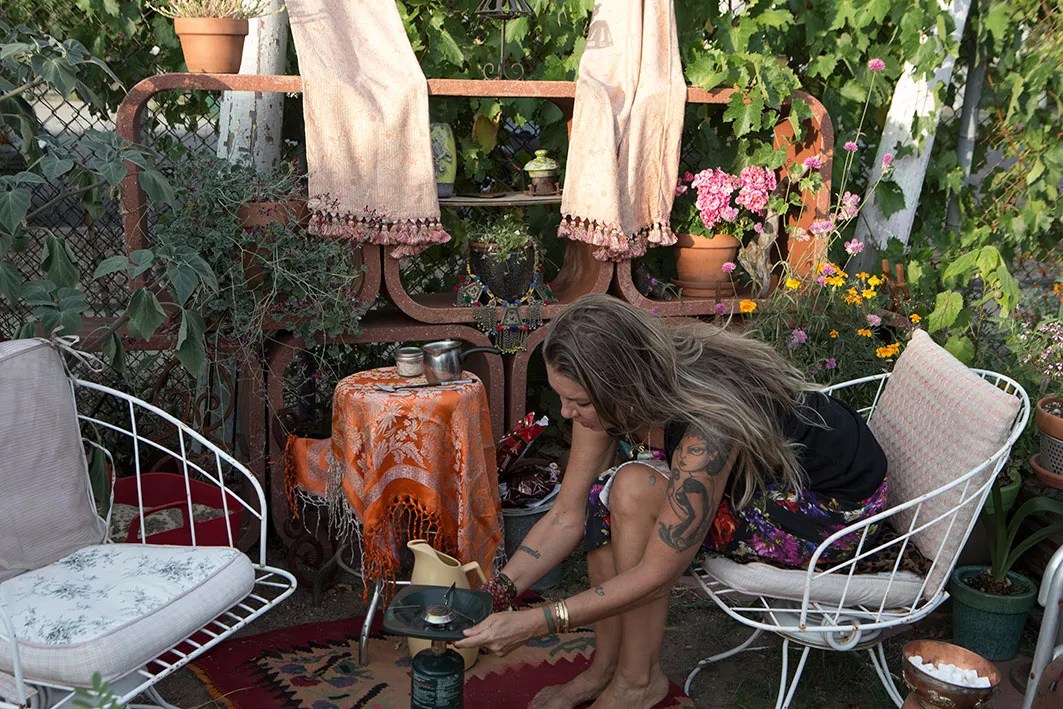 Silvana Vukadin-Hoitt reading coffee grounds in the garden at Hinterland.
