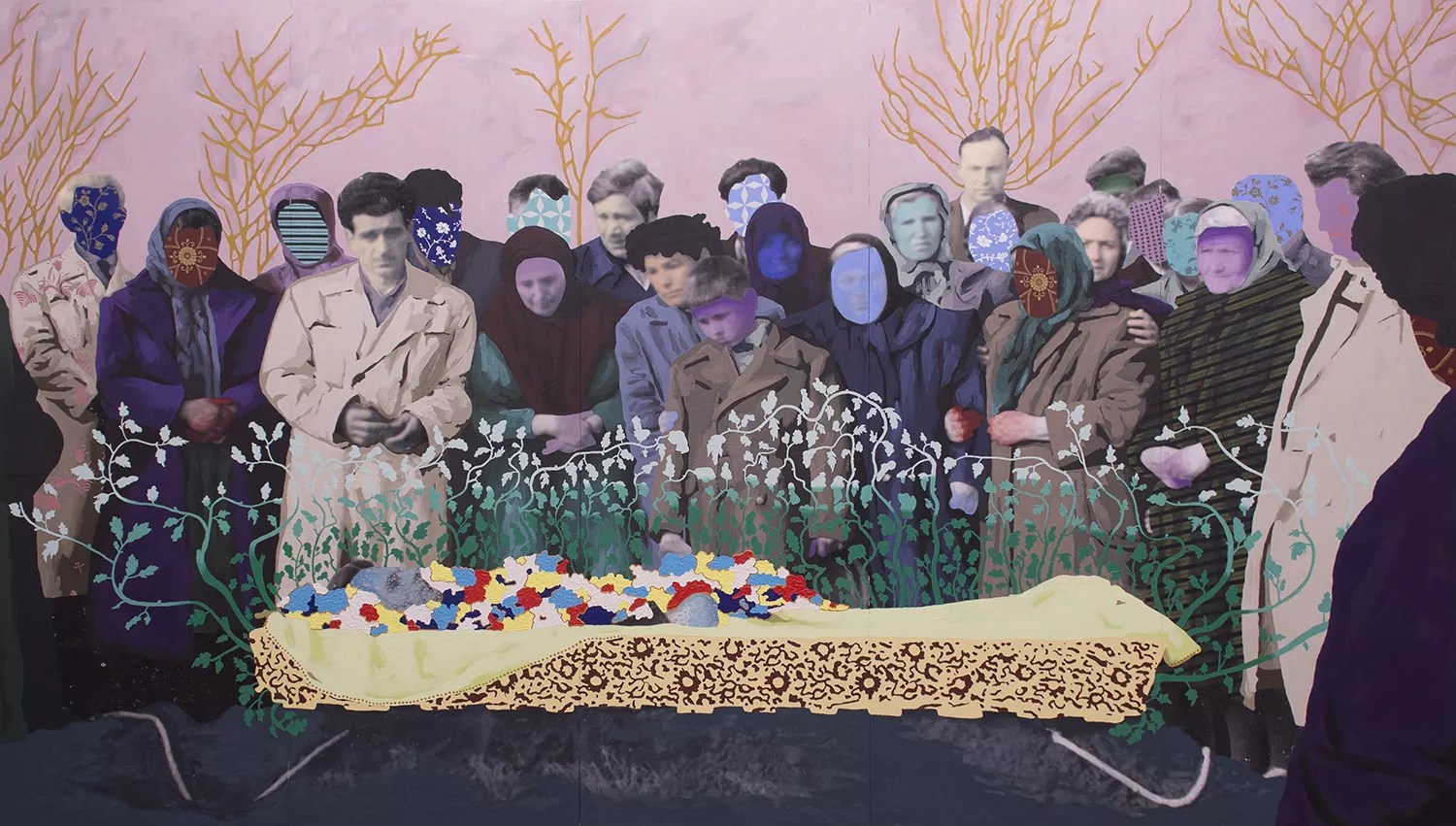 Even more monumental – and not just because it’s bigger, but because of its solemnity and the formality of the composition – is “Untitled (A Bulgarian Funeral).” Running across the bottom third is an open coffin with a man in it, bedecked with flowers. Behind him are a line of mourners facing the viewer. Patton has painted a leafy vine that separates the dead man from the others, and she’s evocatively added bare trees at the back, along with other details. It’s fabulous.