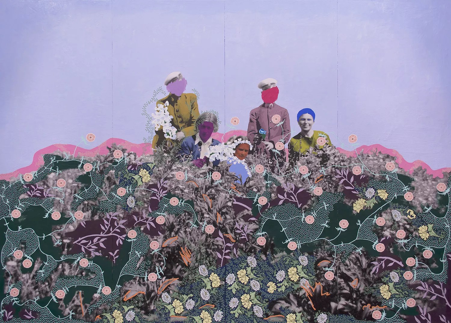 By volume, Patton’s eye-catching solo mostly comprises easel-sized altered head shots, but it is her mural-sized paintings, typically capturing groups of people self-consciously posing, that set the tone for the show. As you enter, you can’t help but be drawn to one of those, “Untitled (In a Meadow),” which pretty much covers the north wall. Running across four vertically oriented panels that have been lined up horizontally is the image of a small group of men and women in a meadow. The people are placed in the top half of the composition, and below and engulfing them are stylized flowers and vines that Patton has painted over the photographic depiction of the real flowers and vines that fill the actual meadow in the original photo.