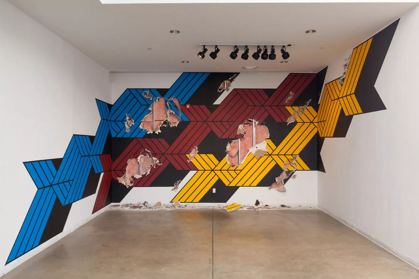 Subtly was not the way that Sandra Fettingis responded to McGowan’s call; rather, she got downright dramatic. Her installation in the entry gallery, “With or without,” is one of her super-graphic wall murals, the kind you see on buildings all over town – but she has vandalized this one, repeatedly taking an ax to it and cutting away large swaths that are left in piles on the floor. In doing so, Fettingis conveys the impermanence of her work in a rapidly changing city – but it’s still sad to see the piece being destroyed, and I would have liked it better unmolested.