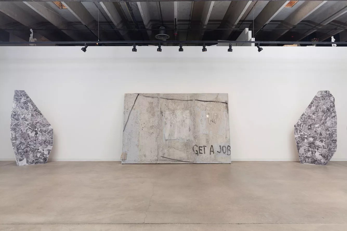 Beyond is a spectacular three-piece grouping of works by Mario Zoots called “Bad and Boujee,” which looks something like an urban altarpiece. A large panel in rough-finished concrete touched up with latex and litter is in the center, leaning against the wall. Standing on either side are collage-covered wooden armatures in the shape of silhouettes of rocks. Zoots began his art career as a graffiti tagger, and the phrase “GET A JOB,” spray-painted on the concrete, is a reflection of that – and seemingly the way the piece most directly relates to McGowan’s concepts.