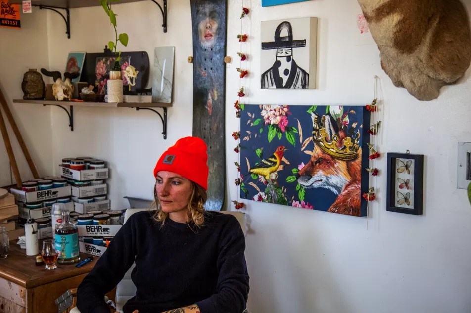 Alexandrea Pangburn in her studio with the painting that she made back in 2019 for the Collectors Art Series.