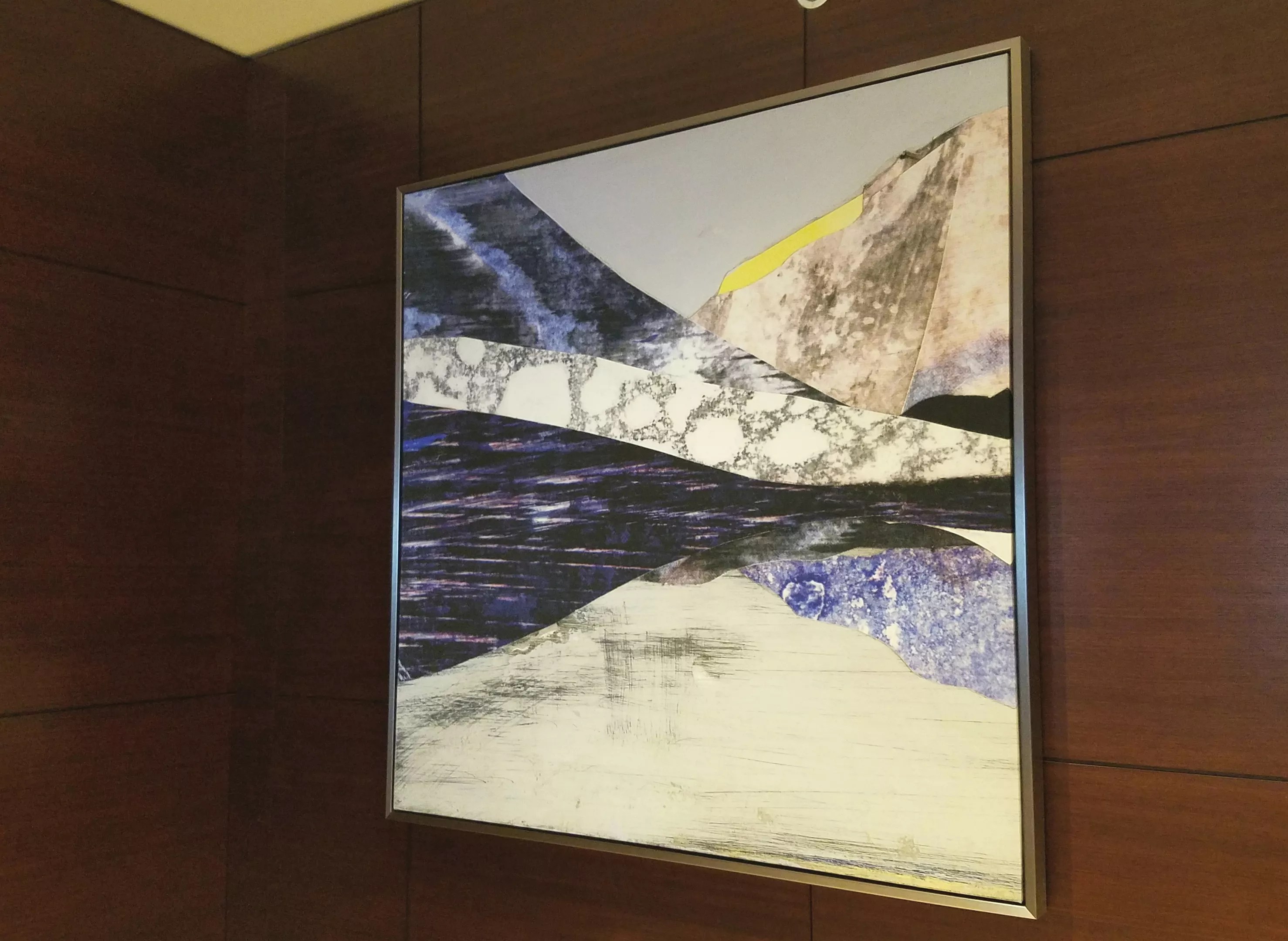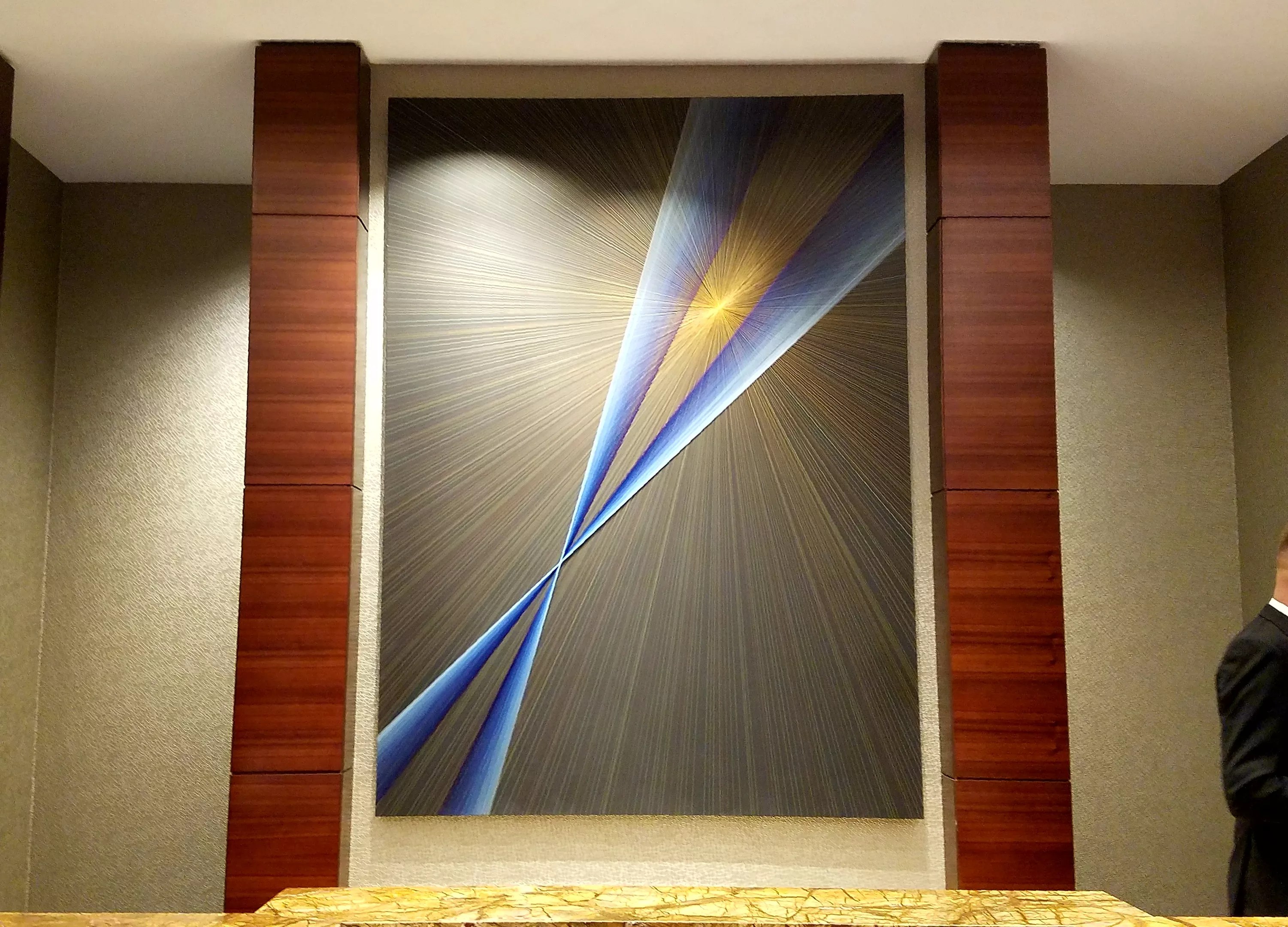 From there, head to the front desk, where you’ll encounter Jeff Richards’s “Eros and Agape-Union.” From afar, you’d never suspect that the artist’s medium is embroidery thread. This large piece features eight miles of the stuff woven across the canvas to create bluish triangles and what looks like a bright light gleaming from behind the azure lines. The work has 600 nails placed in the back so that Richards could loop his thread; if you look closely at the edge of the work (by asking, of course, since it’s behind the desk), you can make out the tiny slits along the perimeter – 7,000, to be exact. One of two pieces in Brenda Biondo’s “Remnants & Revival” series; this one is by the elevators. Linnea Covington