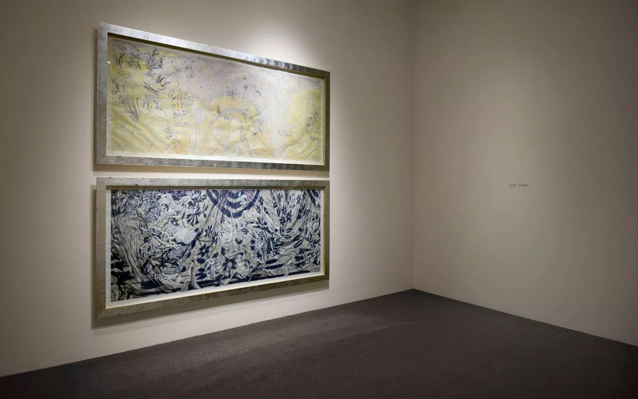 The solo creates a mood that could be described with the old phrase “the abstract sublime,” but sometimes clichés work, and that’s the case with these Lieber paintings. Maybe it’s their grand scale, or maybe the lines against fields, but for whatever reason, they remind me of Clyfford Still‘s paintings. It’s not that the Liebers look anything like the Stills (all right, they do a little); it’s the vibe they exude. This is especially true of Lieber’s super-impressive, ten-foot-tall “New Sprout”: Even if it didn’t have that leading title, it would still suggest the landscape, in this case a tuft of grass on the plains. Against a ground in which other lines have been painted out or smeared over, there’s a tangle of vertical lines that runs up the middle. Part of this painting’s appeal is its utter simplicity contrasting with its epic size; looking at those middle marks, it’s possible to imagine Lieber jumping a little to get to the top. This is the masterpiece of the group, totally majestic. A pair of “Raga” prints by Judy Pfaff at Robischon Gallery. Courtesy of Robischon Gallery