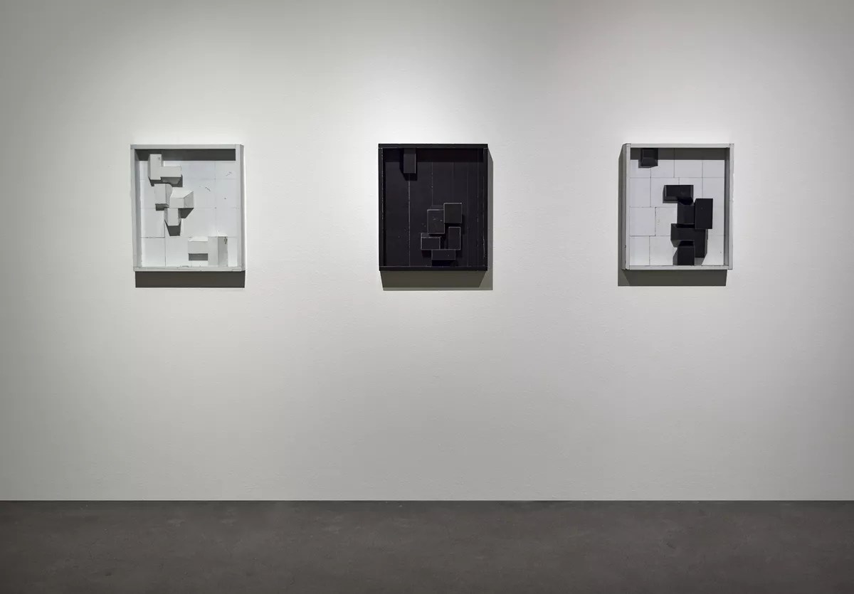 In “Toll Free,” a blocky yellow shape wraps around a smaller orange element; the sides are chamfered, which plays with perceptions of perspective. Larsen is always interested in altering space through the manipulation of perspective, but he really pushes it in a suite of unusual geometric abstracts, in which a cluster of hard-edged shapes are set into boxes that function as shadowbox frames, most of them carried out in a single color. Though these shadowbox sculptures are clearly non-objective, they give the sense of a stage set, with the mutated rectilinear constructions within the framework serving as the characters in a play and adding surrealism to the influences Larsen is channeling. They’re a little Joseph Cornell, a little early Giacometti and a little Donald Judd, all blended together into a totally new look that’s signature Larsen.