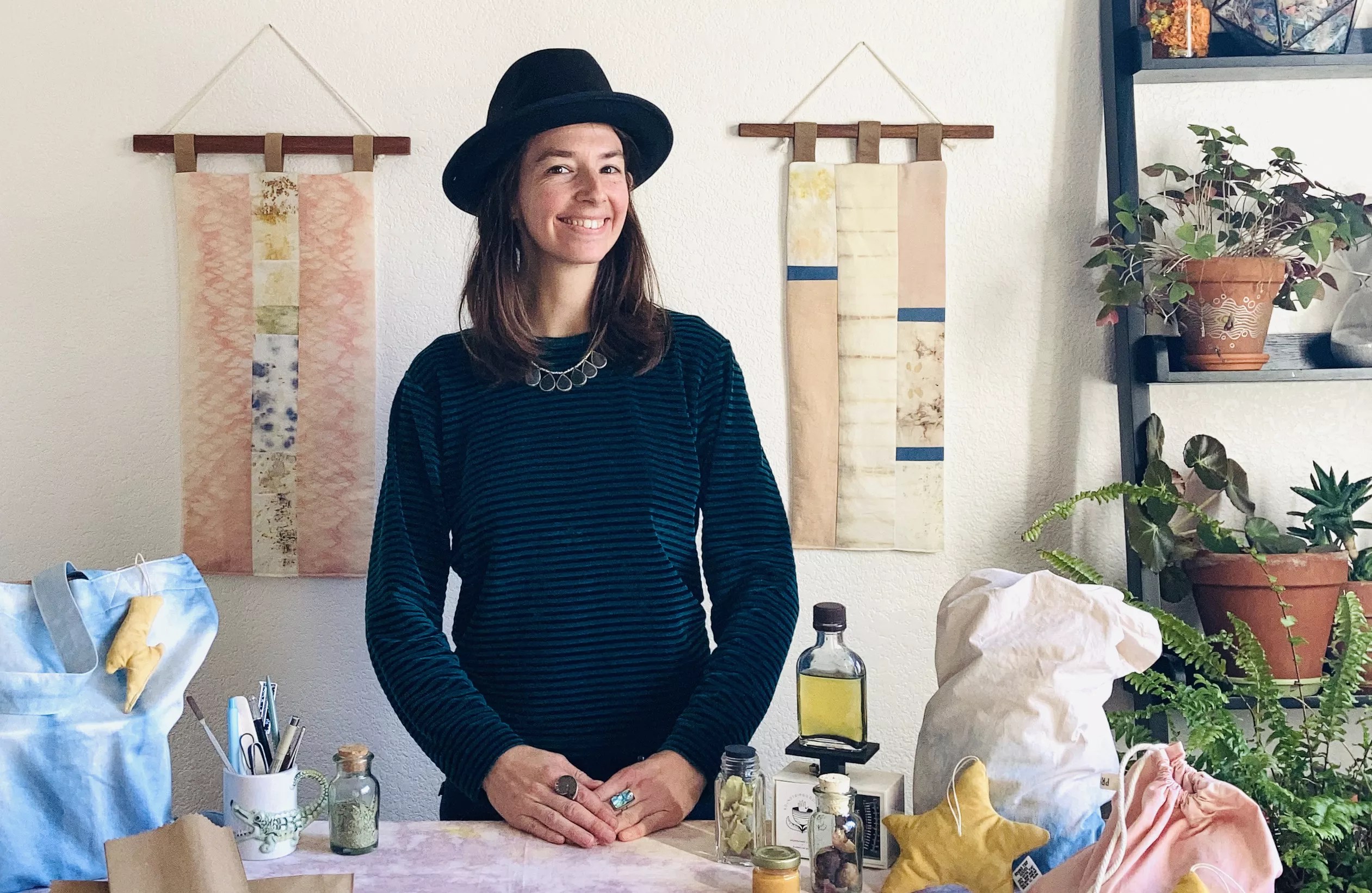 Rich studies plant dyes and sources her fabric from thrift stores rather than buying new fabric. “Creating new fabrics uses so much water and chemicals,” she explains.