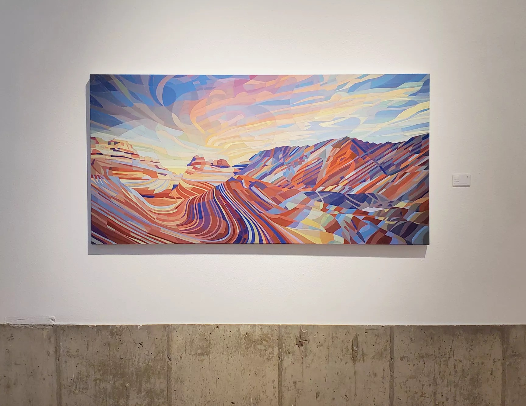 Sometimes, as in “Life After Death,” the results are fairly realistic. In the center is a human skull, a pair of hands covering its eye sockets. The bright white skull and shiny pink hands set against a dark background of flowers reads from a distance like a traditionally painted illustration, but up close the discrete chunks of color atomize the various elements of the scene. Other paintings are clearly aggregations of bits of color, like the hallucinogenic landscapes “Concrescence” and “Portal.” In these, the tinted bits predominate, making the works all but abstract, so they don’t look realistic at all. These two landscapes are standouts in a very strong group.