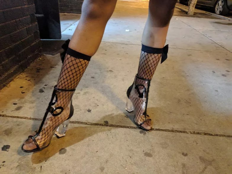 The clear heels are the perfect shoe to showcase fishnet socks; both items are from Aldo, where Michelle works.
