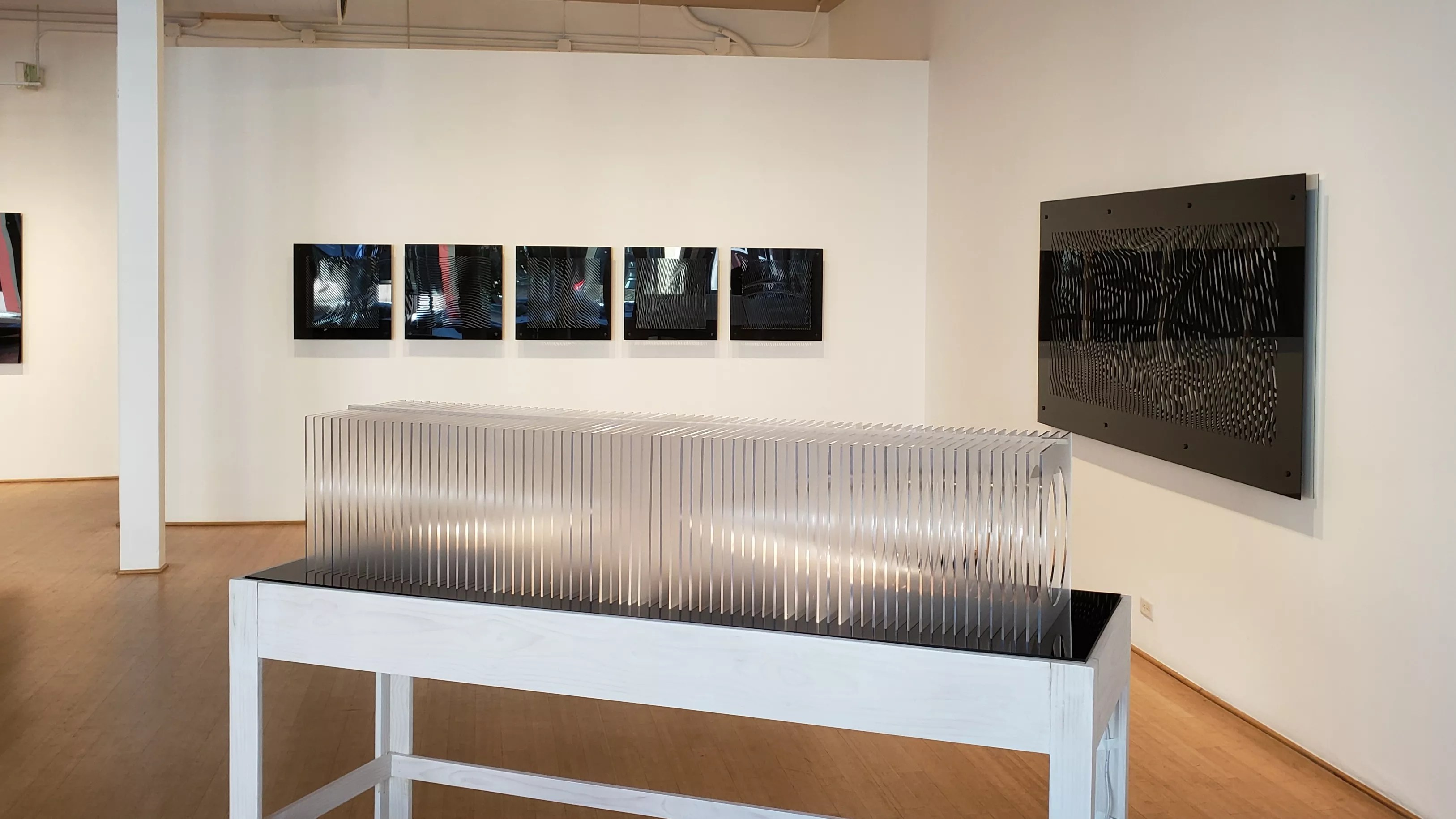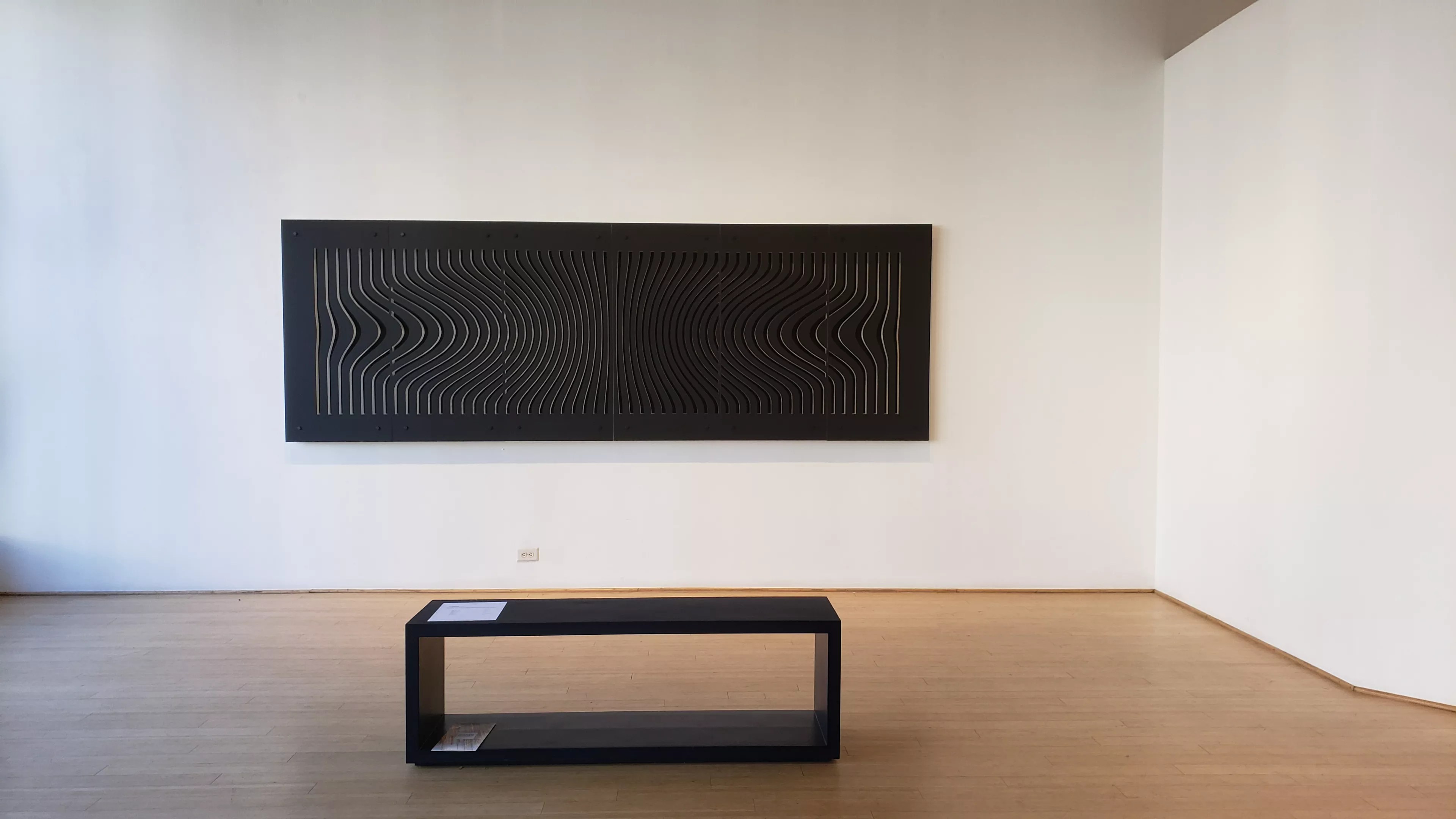In the largest of the works in the “Interference” series, a diptych measuring twelve feet across, Parson has cleverly and elegantly used the solids for the arrangement on the rear panel produced when he created the voids on the front. In another large diptych, the formal arrangement in front filters a different one behind. A third “Interference” piece explores the moiré effect from a new angle; it’s a three-dimensional tower of transparent panels covered with op-y serpentine black lines.