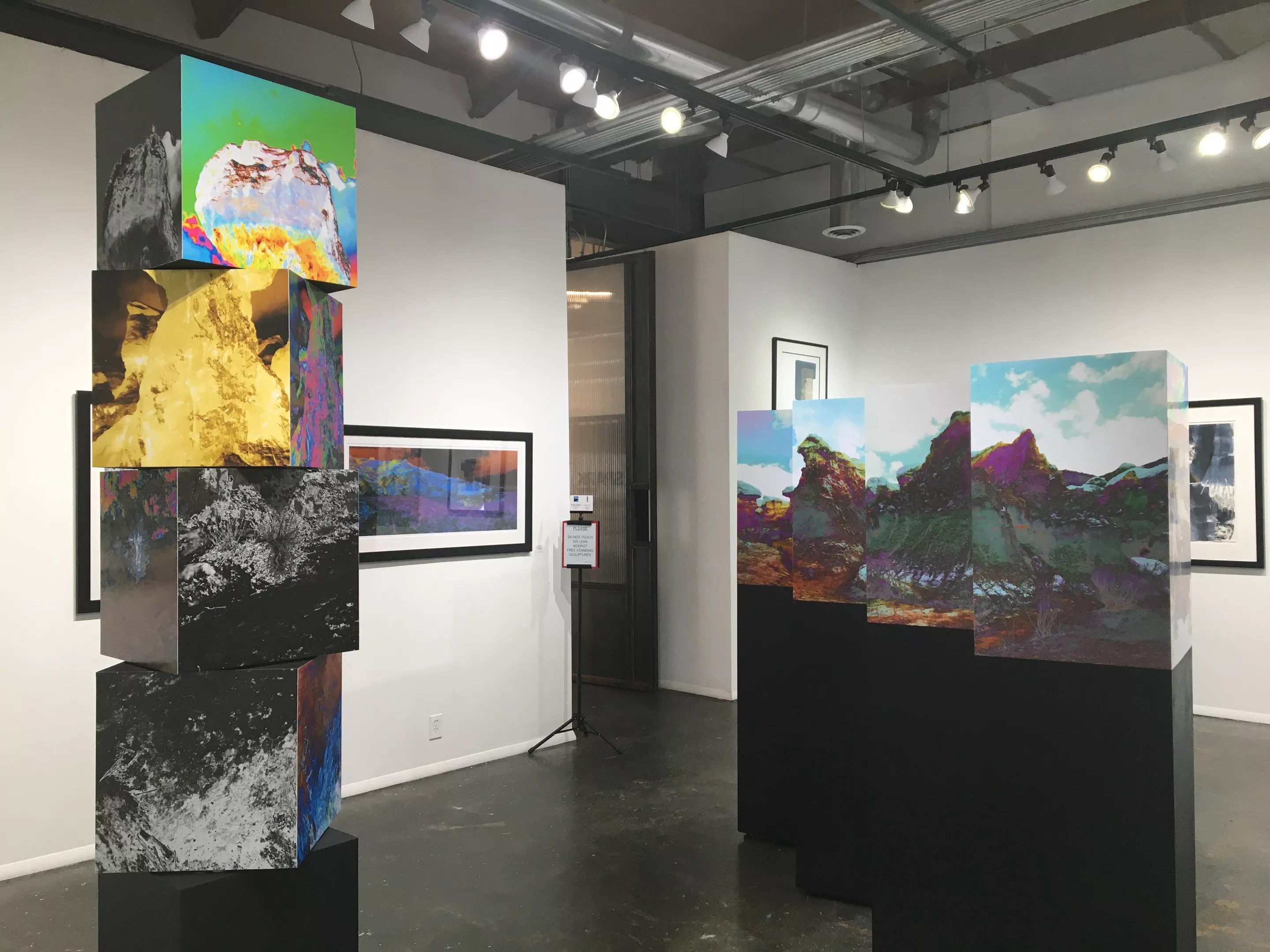 Up the street at D’art Gallery, the city’s newest co-op, longtime Denver artist Terry Decker also uses digital photography to deconstruct the Western landscape in Gems of the West/The Paint Mines. He manipulates photos of the scenes around Calhan’s paint mines until the colors are so toned up they look radioactive. Presented flat in the traditional way, the prints are superbly crafted and eye-catching, but they’re even better when they’re used for a pair of three-dimensional pieces. “Quadtych Columns” is made up of four rectilinear solids arranged point-to-point so that all sides are visible. Adhering images to the standing pillars at eye level, Decker creates four distinct landscapes, each one snapping into view as the piece is circumnavigated. For “#2 Tower,” the same subject is sliced and diced in different ways.